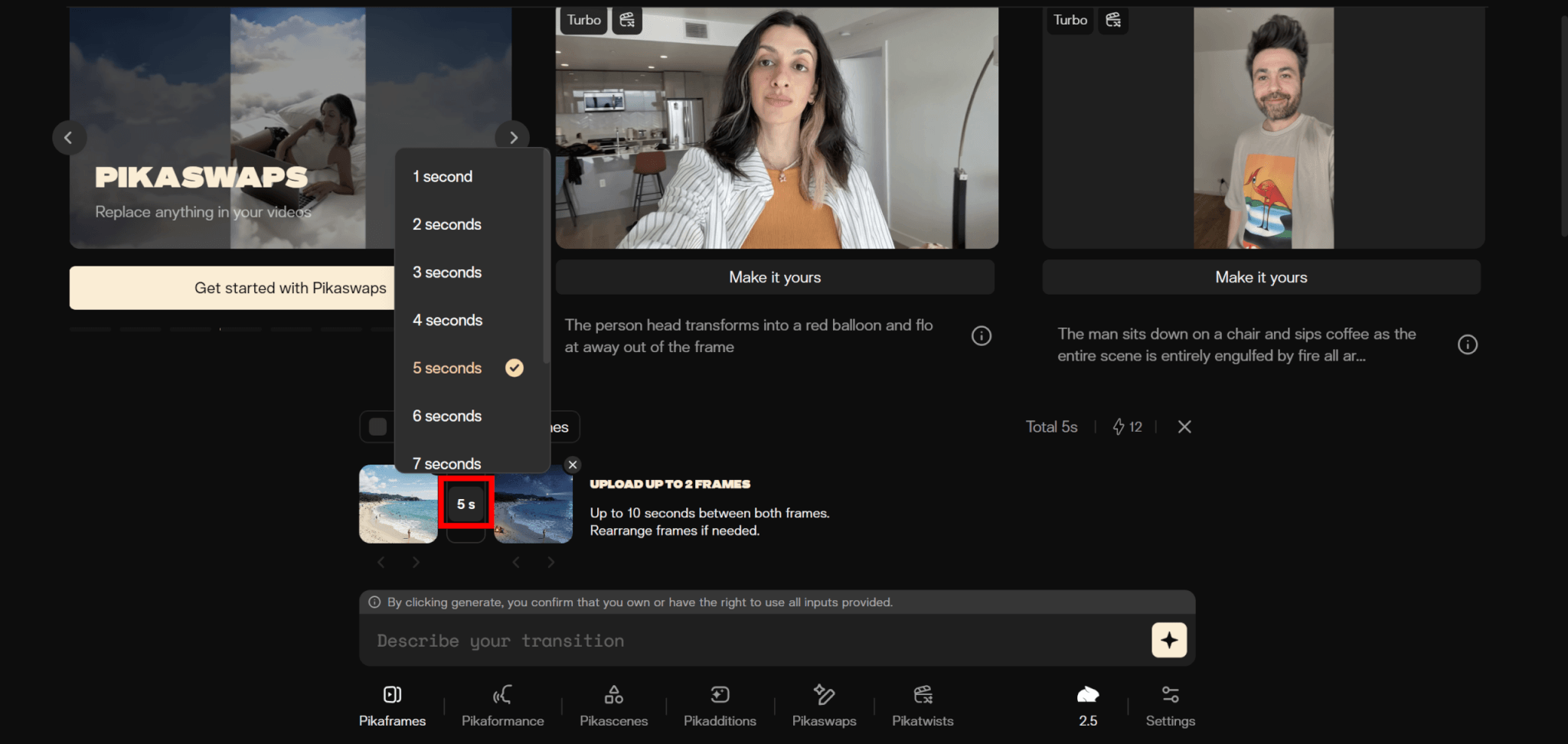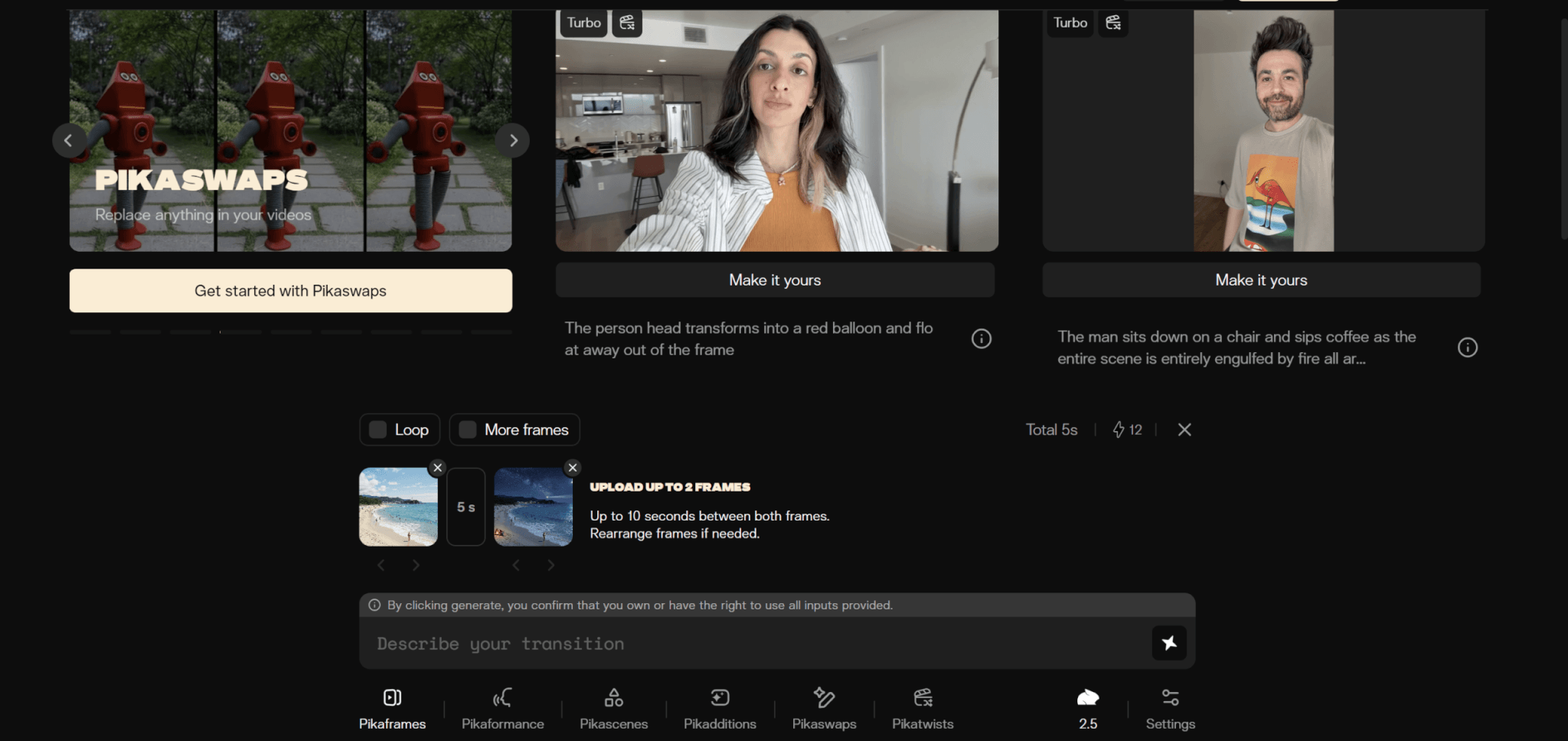 PikascenesやPikaswapsなど、以下のようなそのほかの主要機能については、機能を選択して必要なファイルをアップロードし、プロンプトを送信することで動画を生成できます。