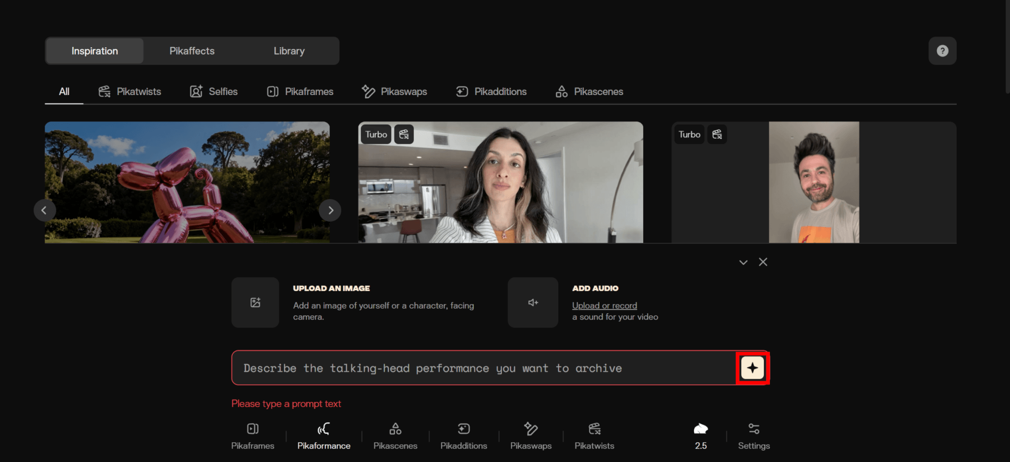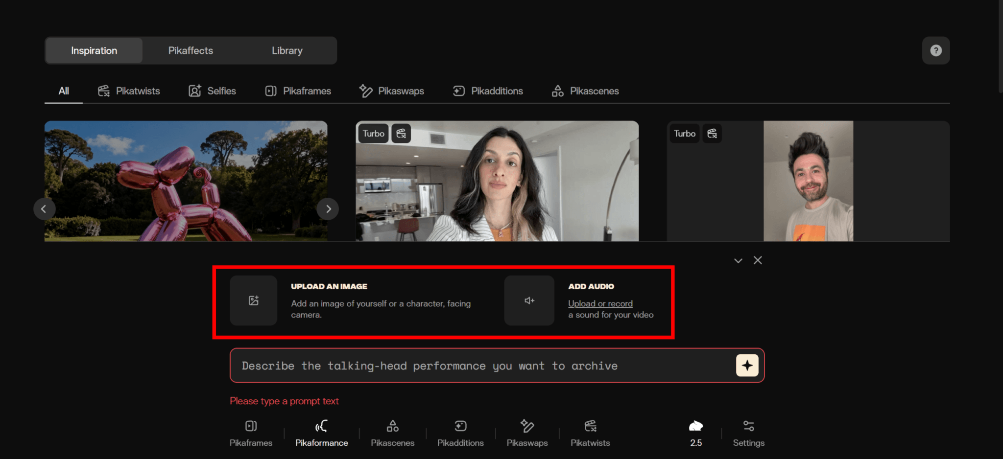 たとえば、Pikaformanceでは画像と音声ファイル、Pikascenesでは画像のみなど、機能に応じて必要なファイルが異なります。