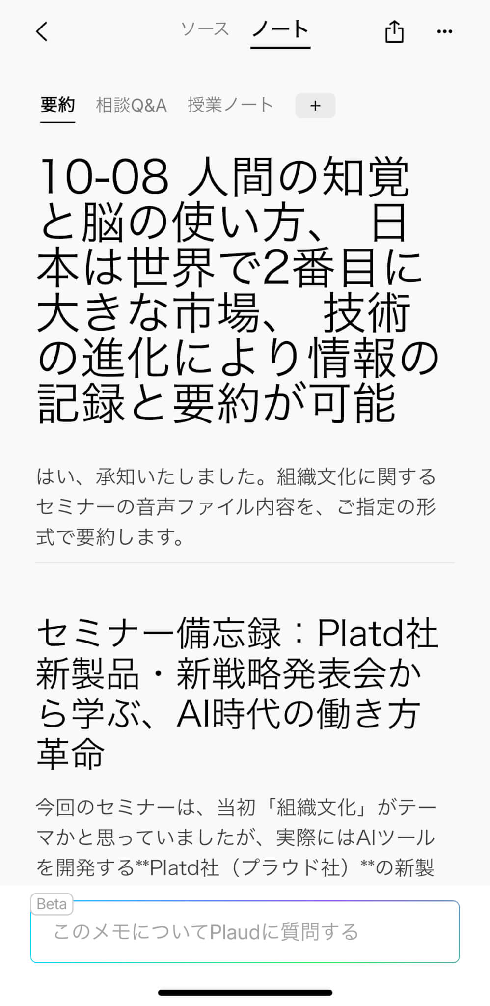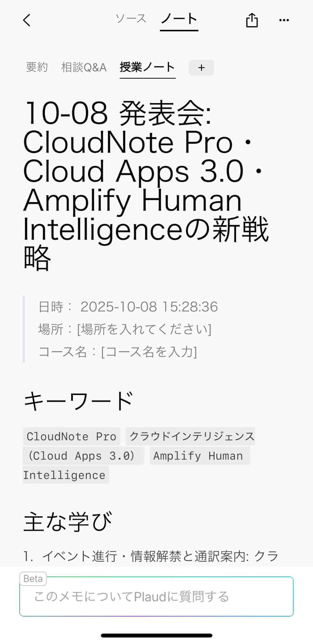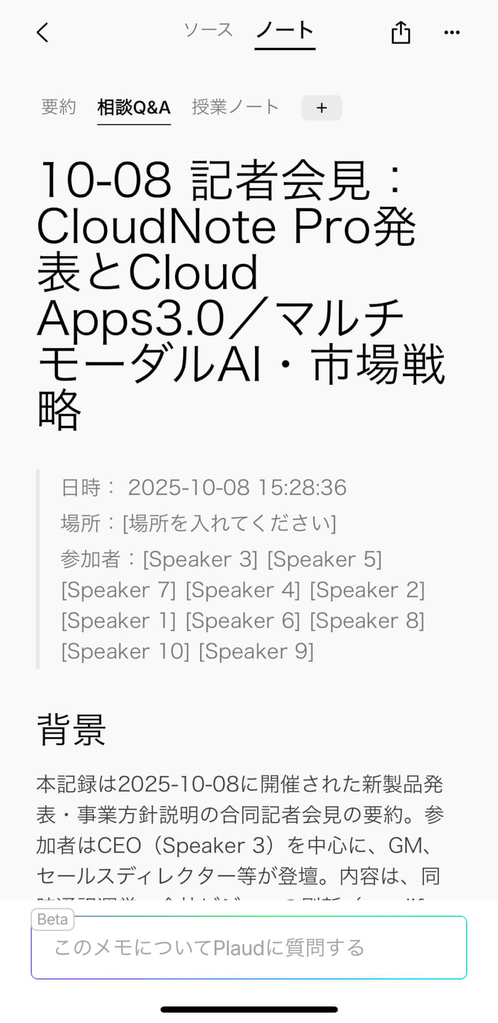 実際にPlaud Note Proの製品発表会を録音したデータを用いて試したところ、「Q&A形式」「授業ノート形式」など、同一の録音データから異なる形式で要約を生成できました。(録音自体は旧型のPlaud Noteを使用)