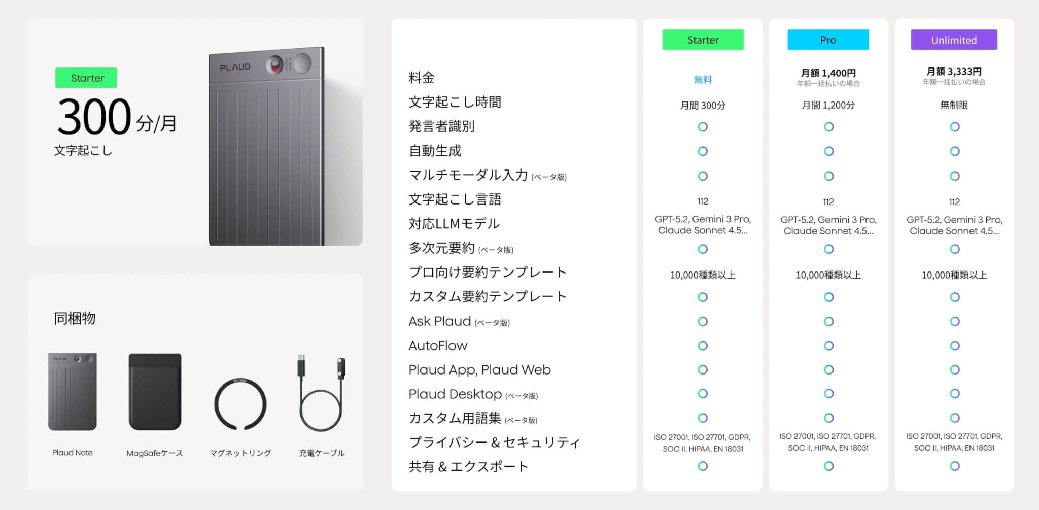 Plaud Noteの本体価格は1セット27,500円(2026年2月現在)で、毎月300分の文字起こしと要約機能を無料で利用できるStarterプランも付属しているので、購入後すぐにPlaud Noteを試せます。