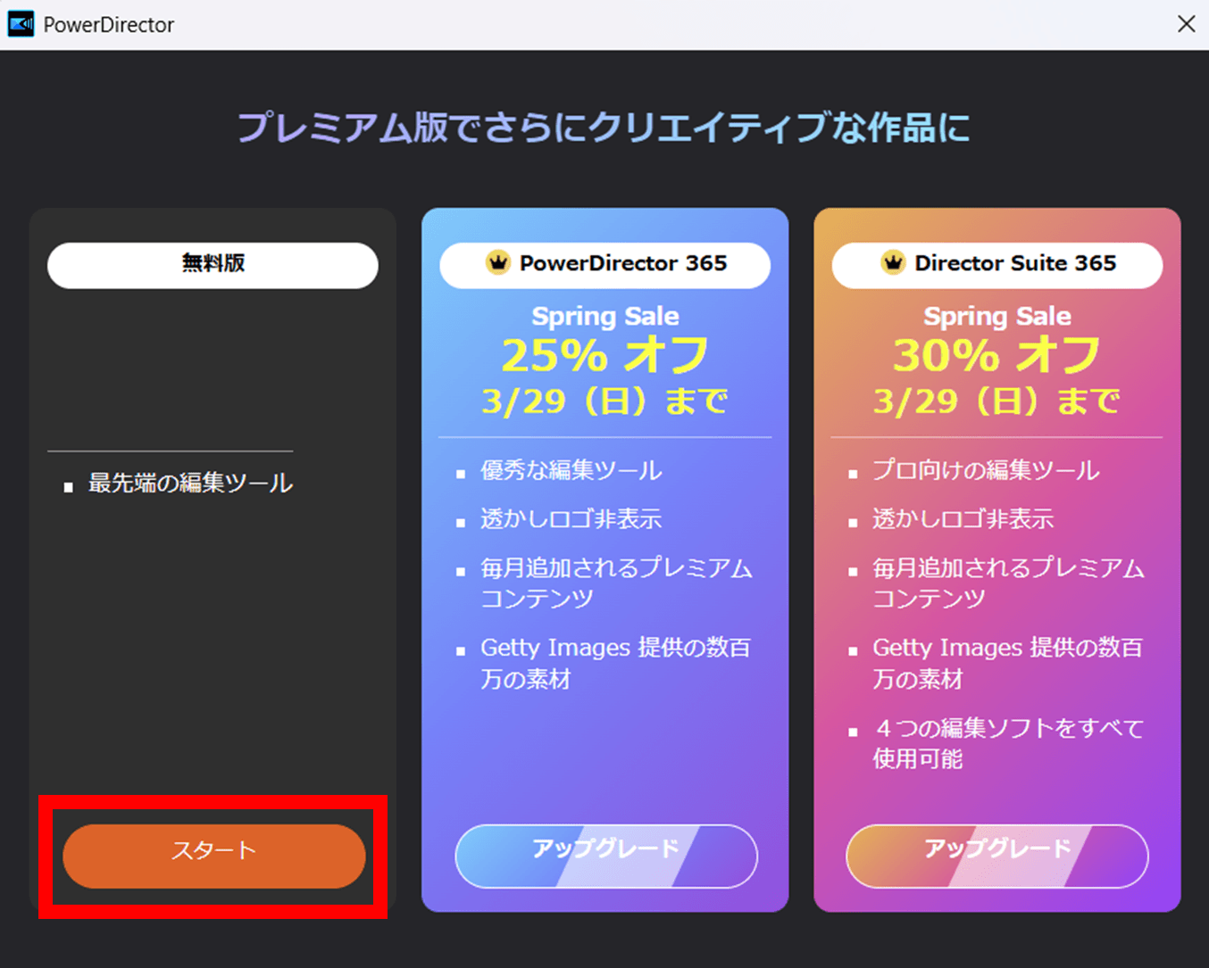 無料版から開始する場合は、「スタート」をクリックしてください。