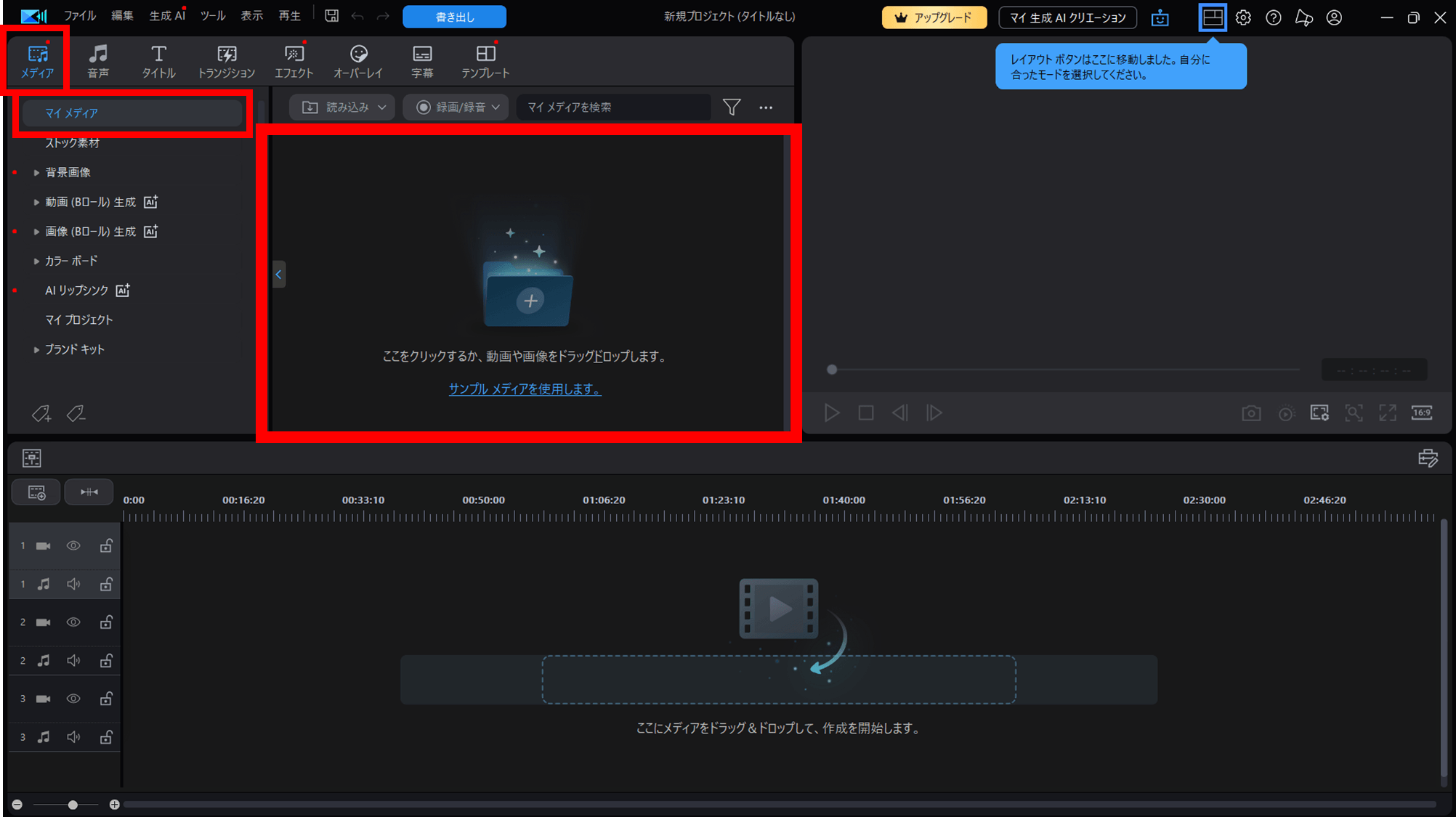 ここでは「サンプルメディアを使用します」からサンプル動画を選択して使用します。