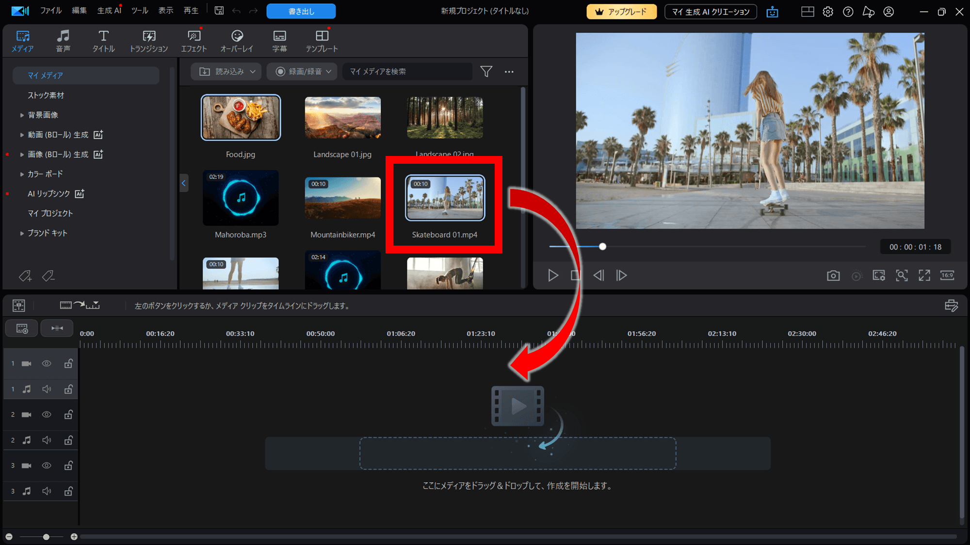 インポートした動画をドラッグ&ドロップしてタイムラインに配置します。