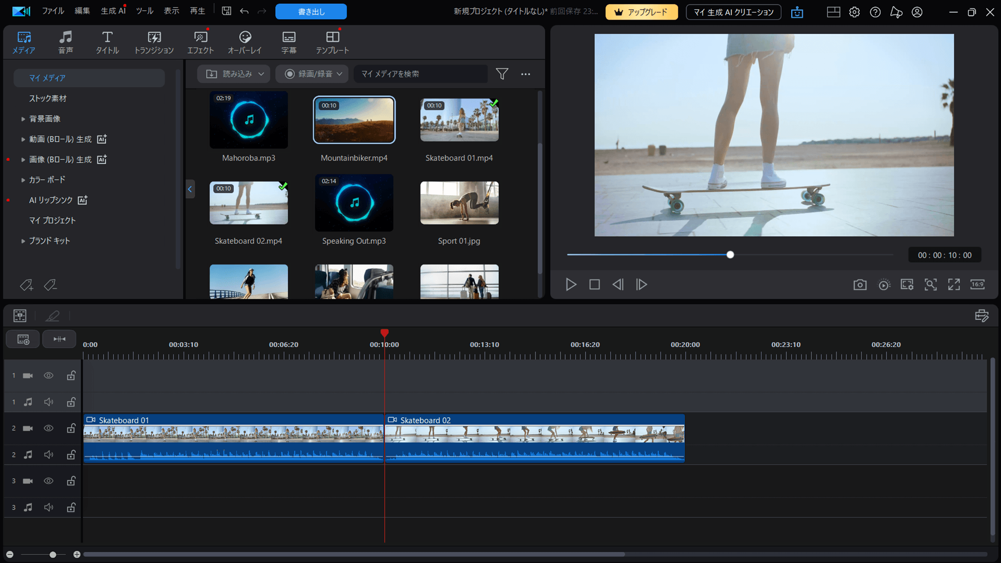 カット編集やテロップ挿入、BGM追加、書き出しといった基本機能に加え、AIを使った編集補助機能や生成AI機能にも対応しています。