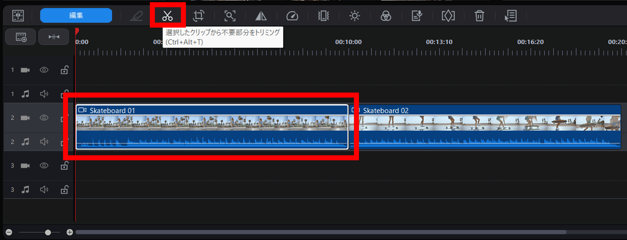 二つ目の方法としては、対象のクリップを選択した状態でトリミングツール(ハサミのアイコン)をクリックしてツールを用いるものです。