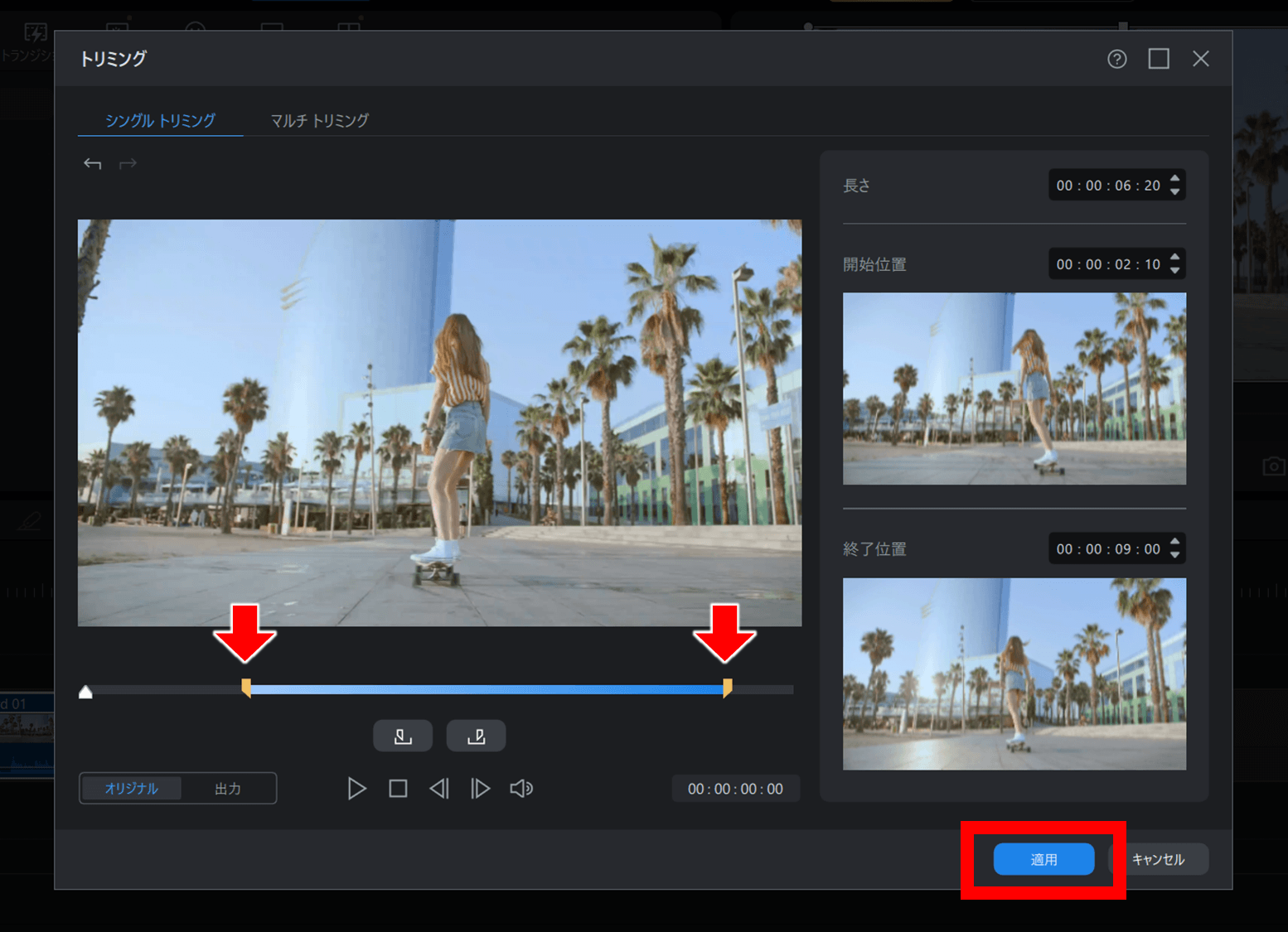 トリミング画面が立ち上がります。動画下の黄色いバーをドラッグして始点と終点を指定します。その後、「適用」をクリックします。