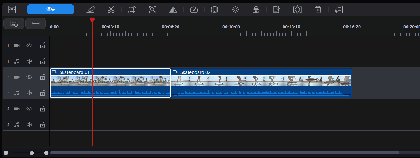 タイムラインに配置することで、動画編集を開始できます。以下のように二つの動画を配置しました。