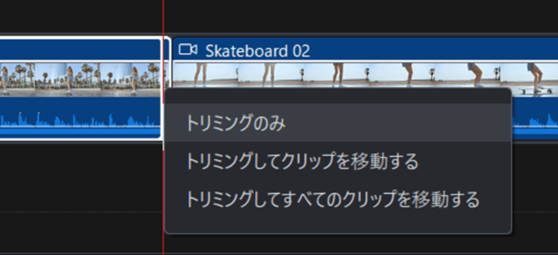 ドラッグを終了するとトリミング方法の選択肢が表示されます。後続のクリップをそのまま詰める場合には「トリミングしてクリップを移動する」を選択します。