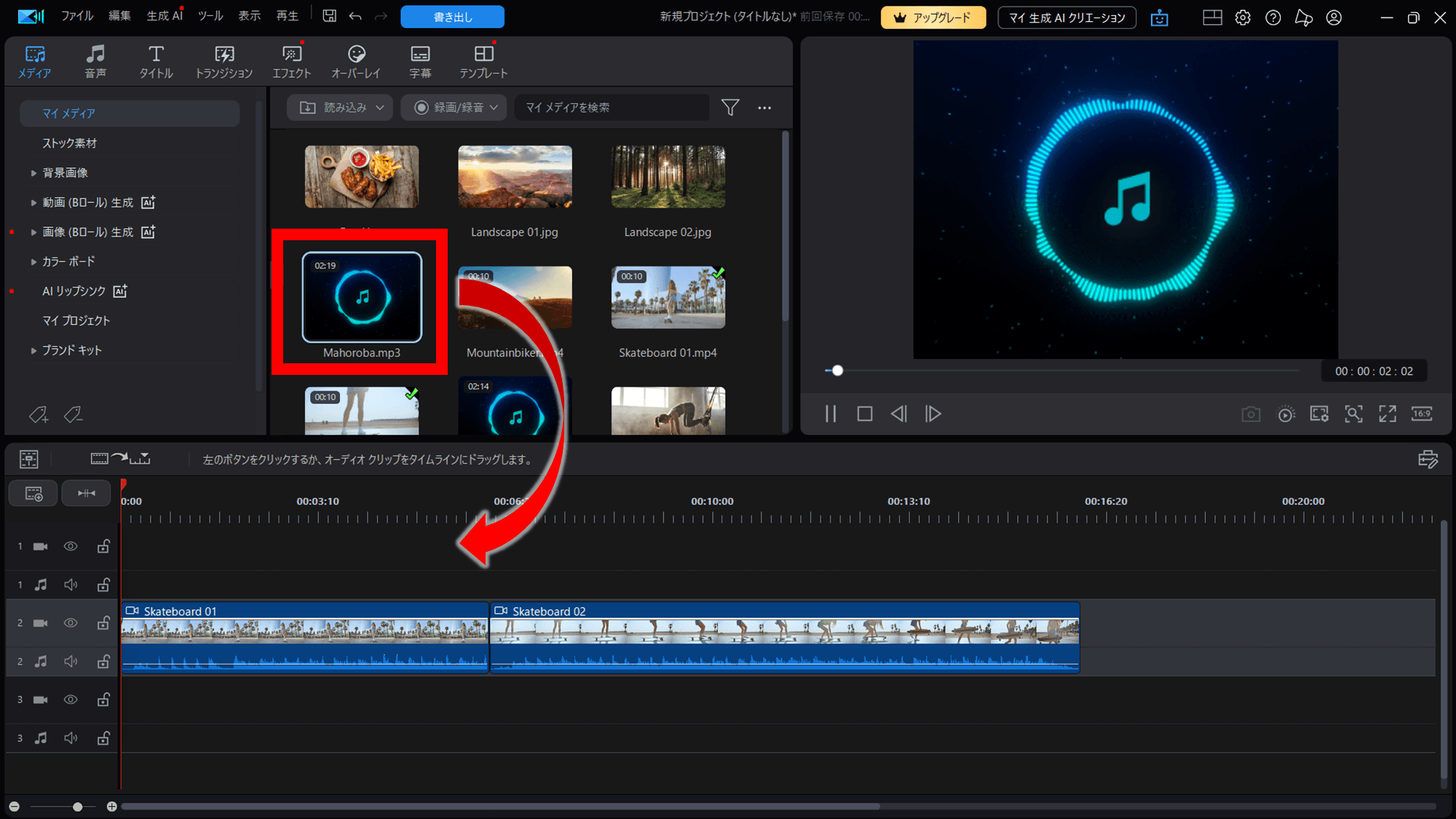 BGMの挿入方法はクリップの挿入方法と同様です。挿入したいBGMの音声ファイルをアップロードし、タイムライン上にドラッグ&ドロップします。