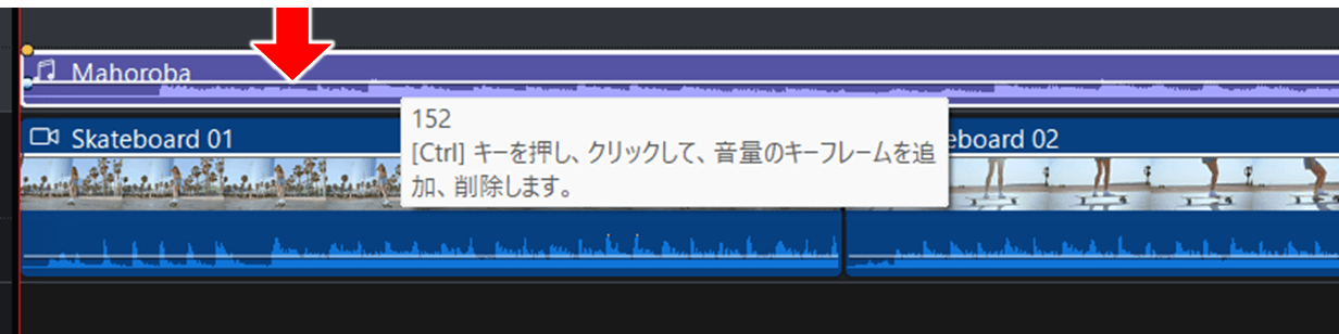 音量の調節はタイムライン上のBGMをクリックして中央に表示される水平線を上下にドラッグすることで調節することができます。