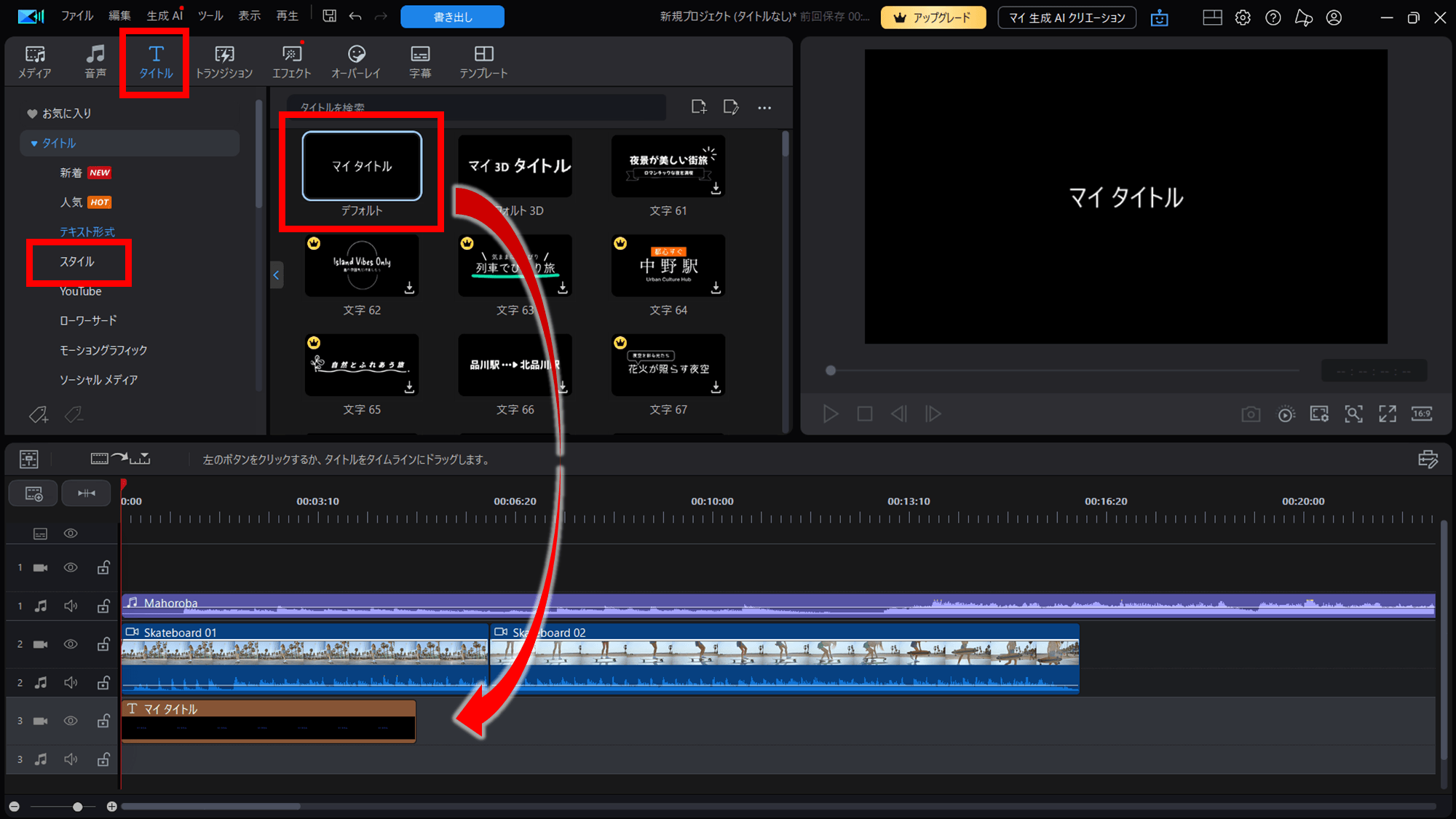 上部メニューの「タイトル」を選択し、「テキスト形式」の中から「デフォルト」をドラッグ&ドロップでタイムラインに追加します。