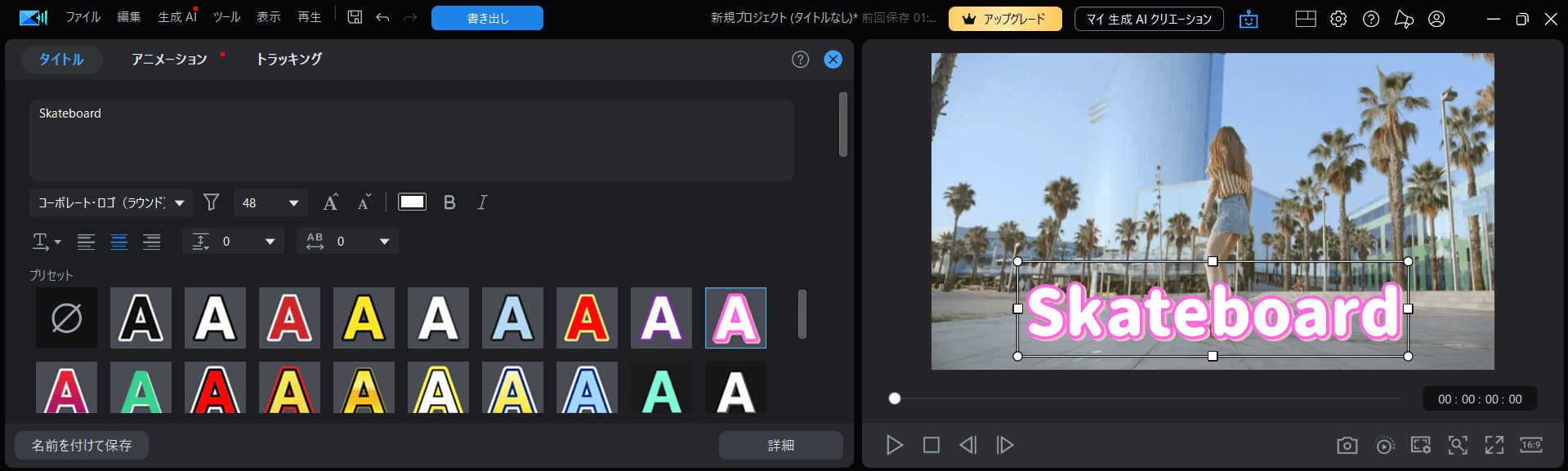テキストの内容や、フォント、大きさ、スタイルなどを変更することができます。また、テキスト入力や位置変更は右側のプレビュー画面からも行うことができます。