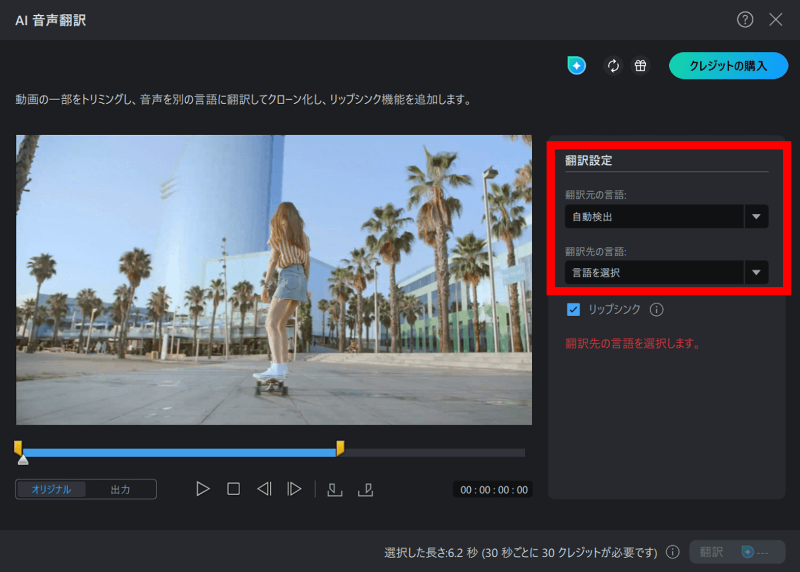 2026年4月時点では365系の限定機能で、クレジット消費は、AI音声翻訳が30秒あたり10クレジット、リップシンクありでは30秒あたり30クレジットです。