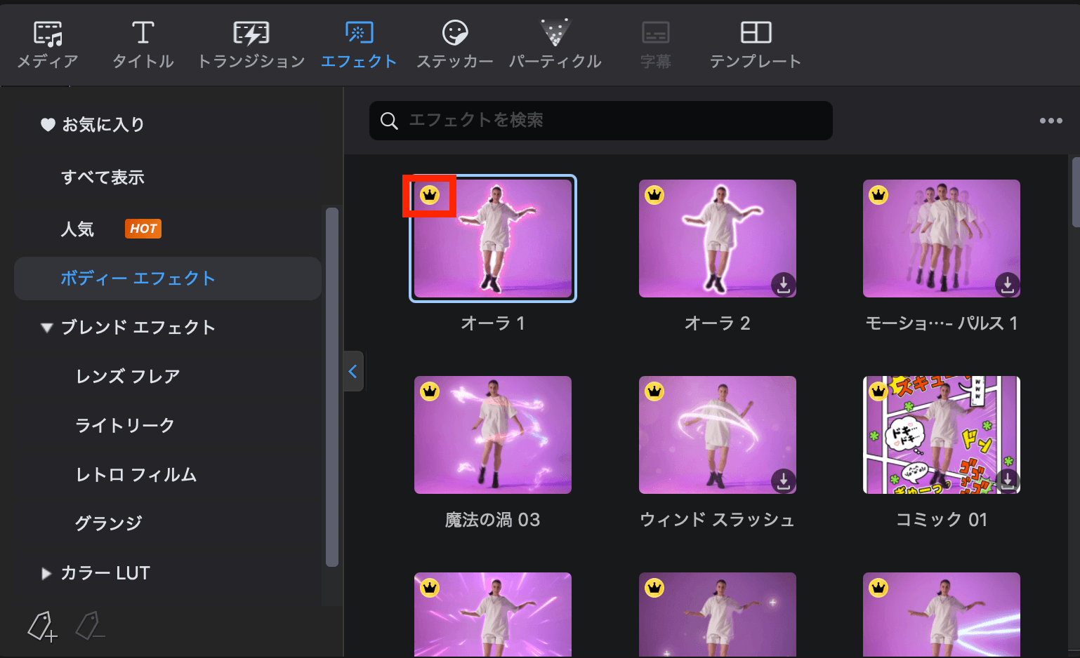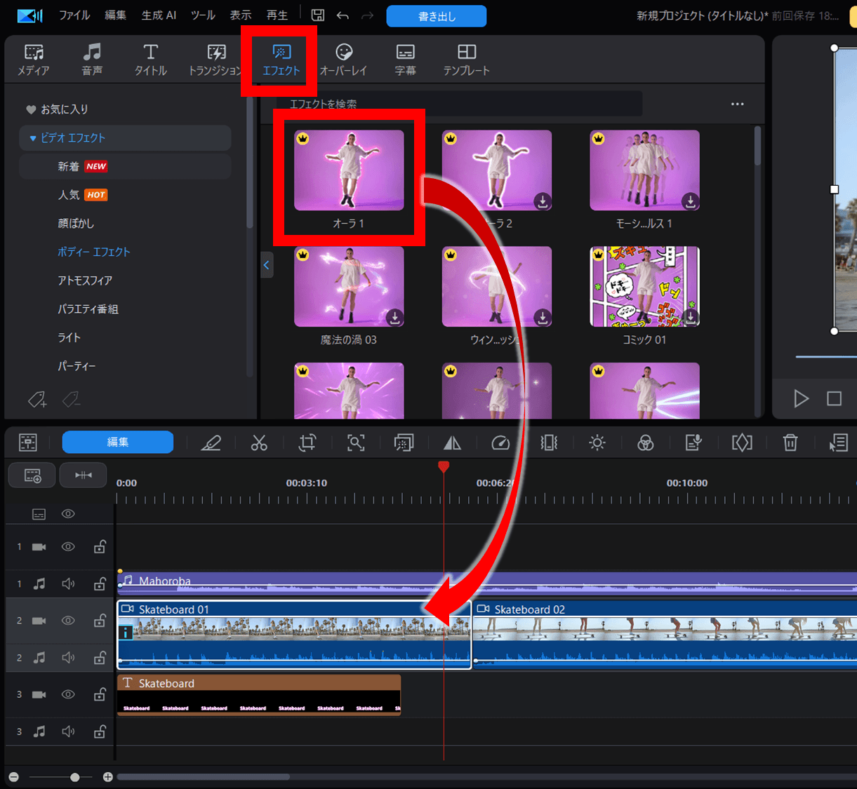 対象のクリップを選択し、上部メニューの「エフェクト」から適用したいエフェクトを選びます(初回はエフェクトのダウンロードが行われます)。エフェクトをタイムライン上の対象クリップにドラッグ&ドロップして追加します。