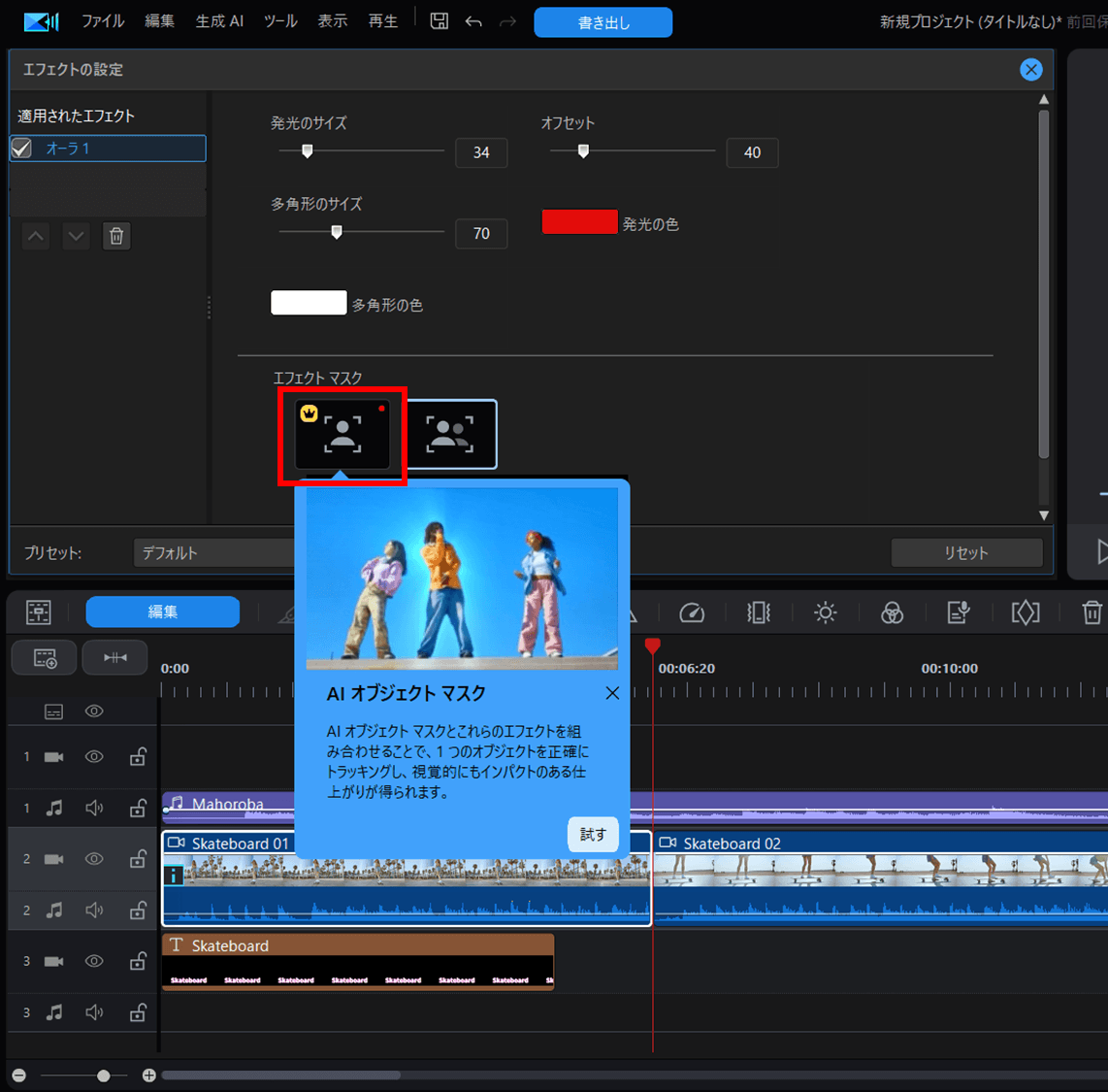 上部に編集画面が表示されたら、「エフェクトマスク」内の「AIオブジェクトマスク」をクリックします。