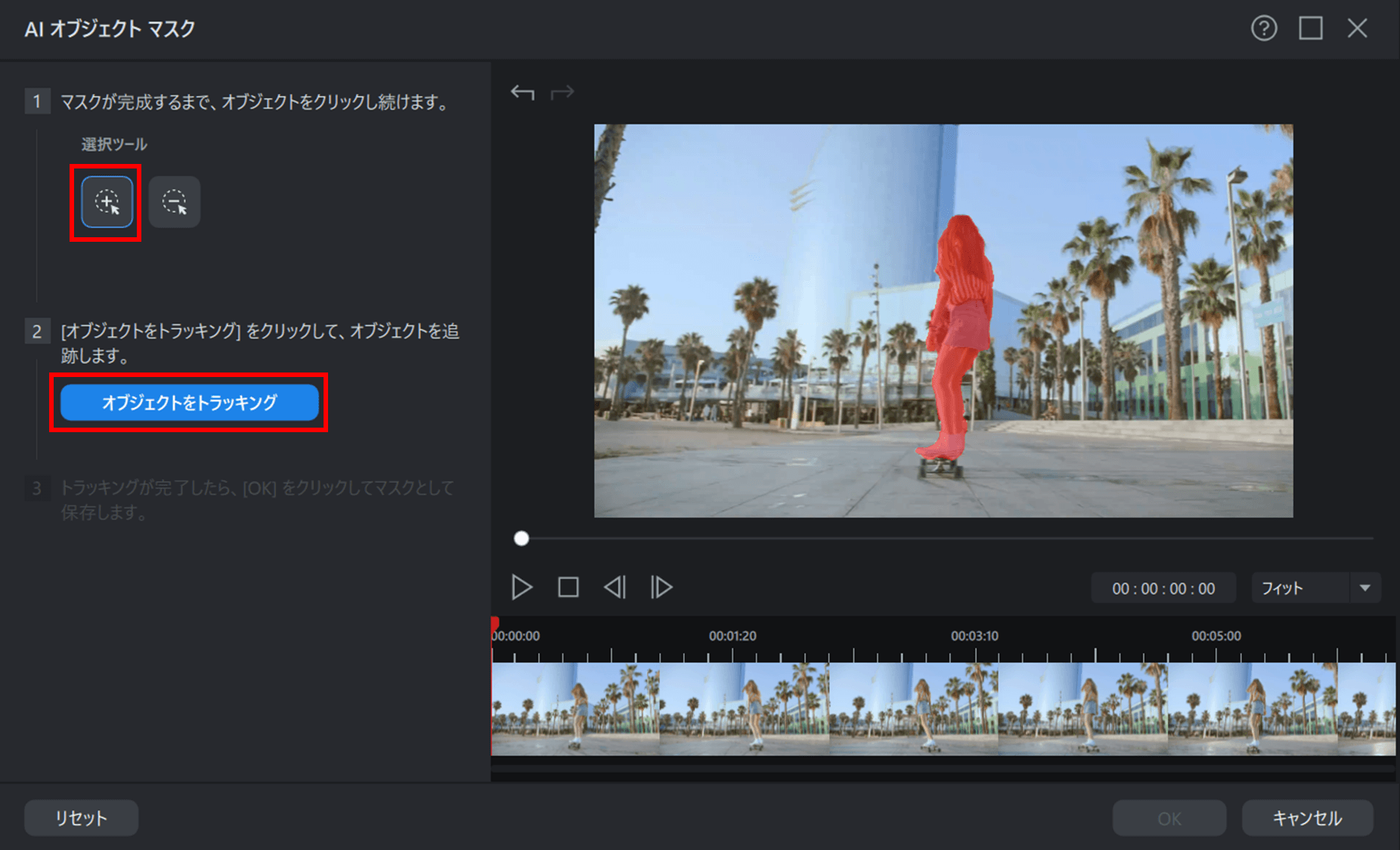AIオブジェクトマスク画面が開いたら、選択ツールを使用してマスク対象のオブジェクト(下記画面では中央の女性)にポインターを重ね、クリックし続けることでマスクを完成させます。対象オブジェクトが正確にマスクされたら、「オブジェクトをトラッキング」をクリックします。