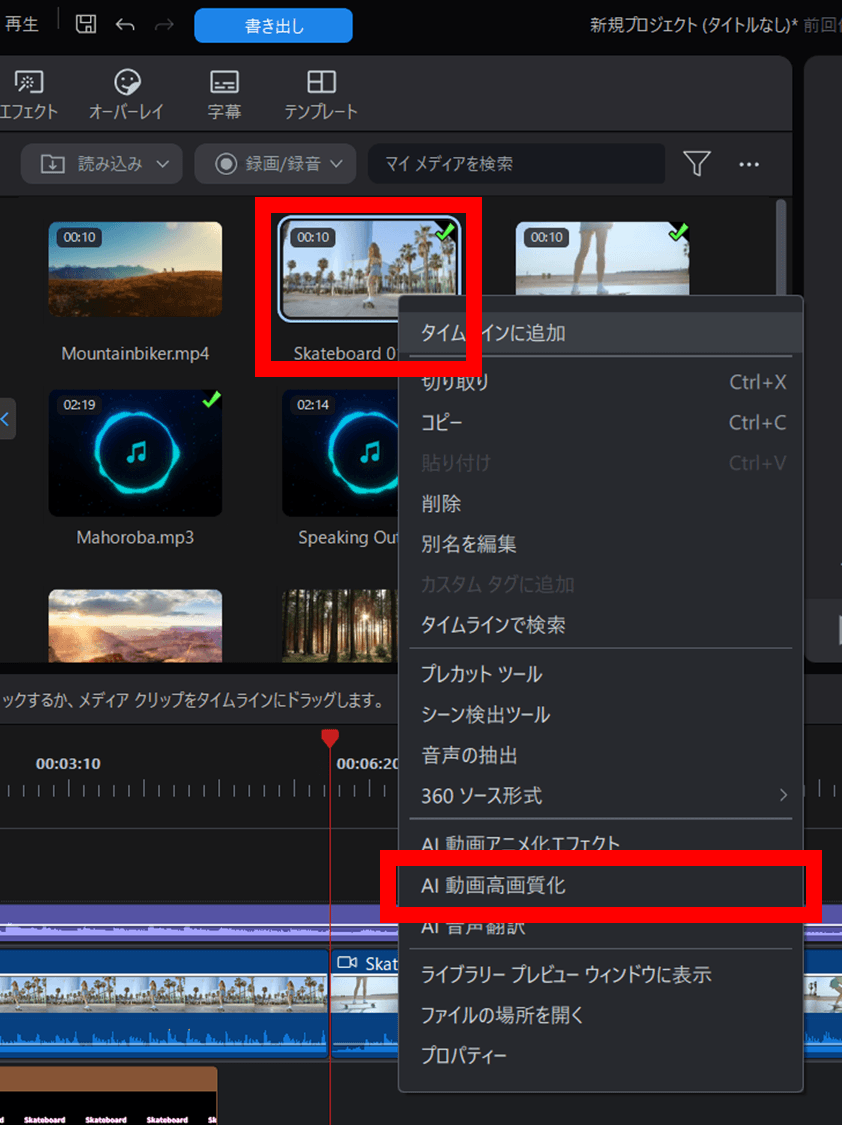 クリップのアップロード後に、素材を選択して右クリックして表示されるメニューから「AI動画高画質化」を選択することで使用できます。