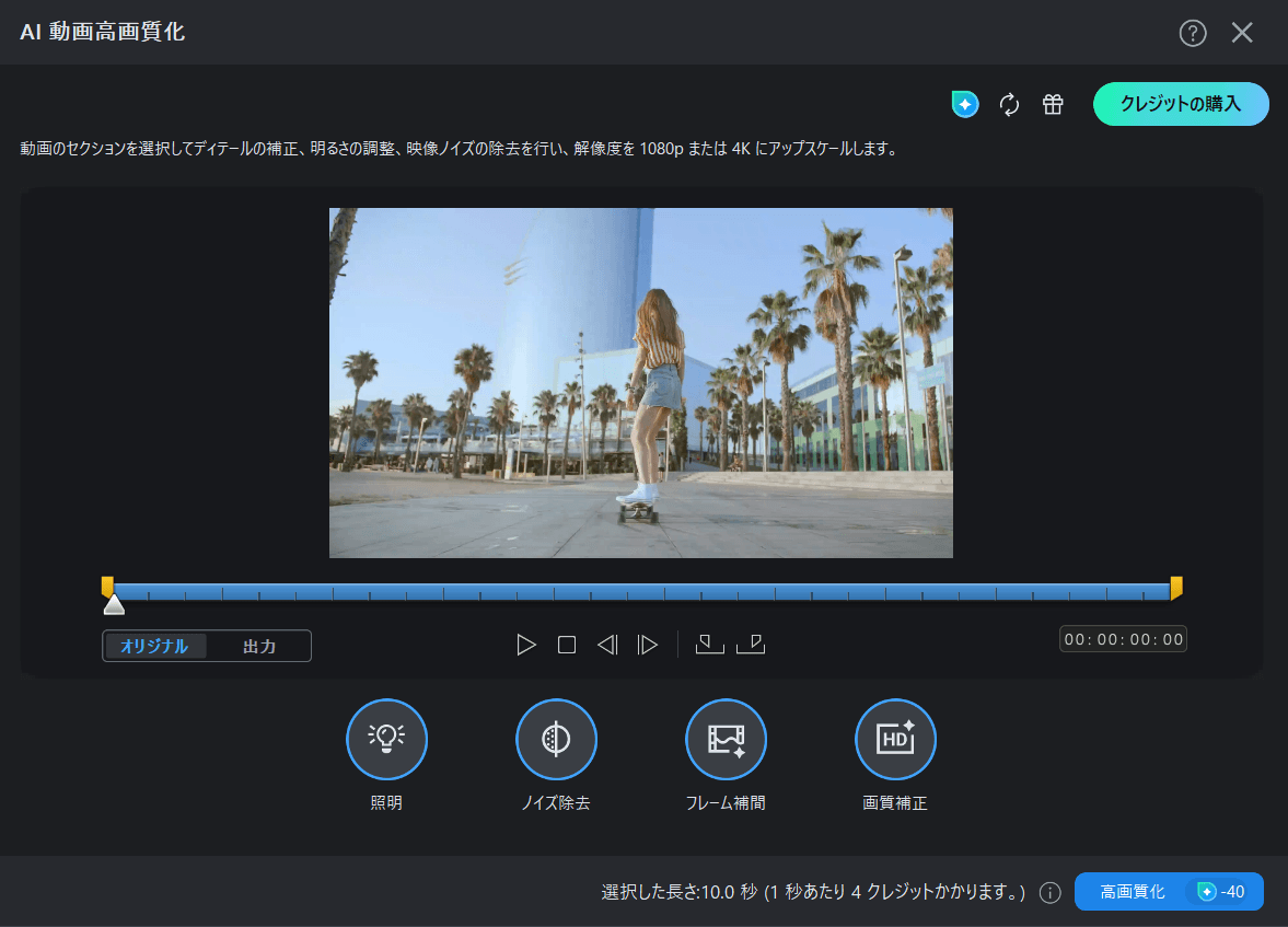 サブスクプラン365系の限定機能であり、クレジット消費は、照明・ノイズ除去・フレーム補完・画質補正が1秒あたり各1クレジット(4つとも適用する場合1秒当たり4クレジット)です。