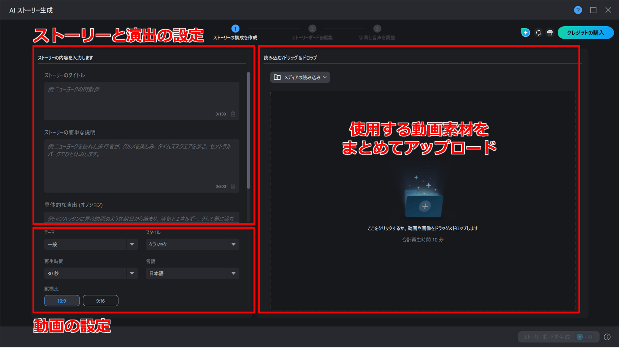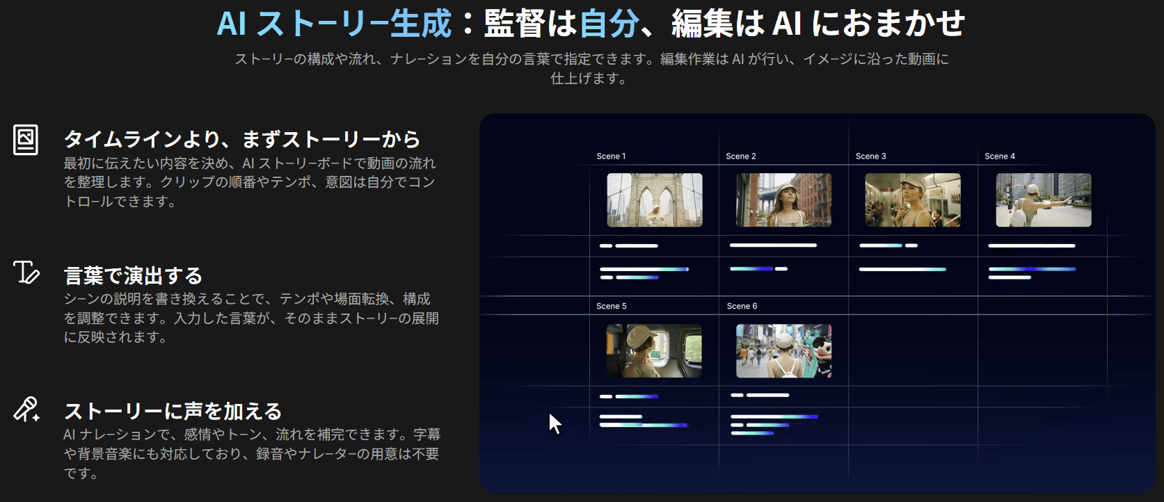 AI自動ストーリー生成は、読み込んだ素材をもとに、字幕、ナレーション、BGM付きの動画構成を自動で作る機能です。ゼロからタイムラインを組むよりも、まず叩き台を作ってから整えたいときに向いています。