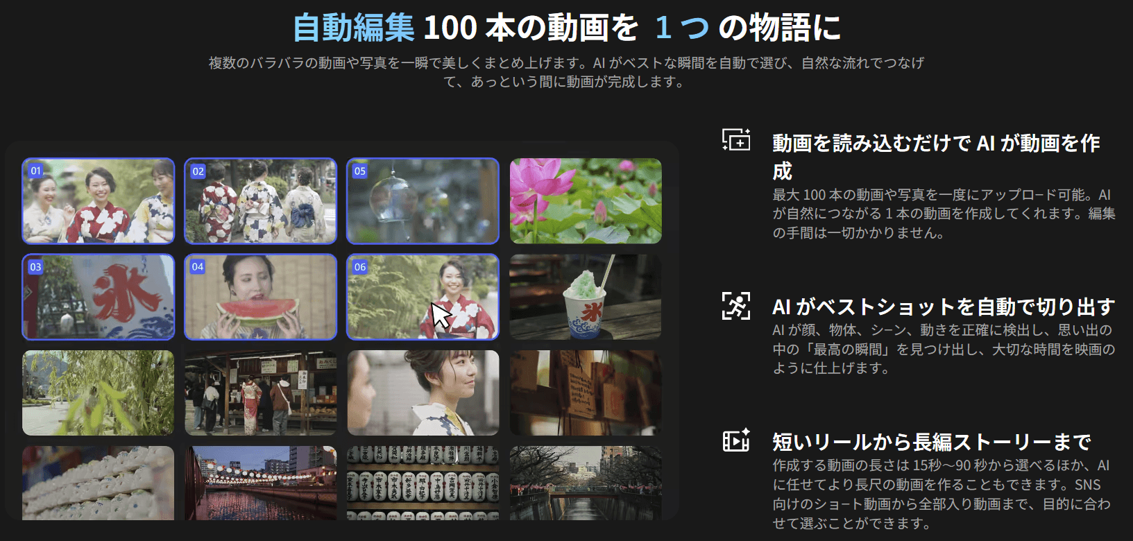 動画や写真などの素材をまとめて読み込み、ストーリーや演出などの条件を設定するだけで生成することができます。