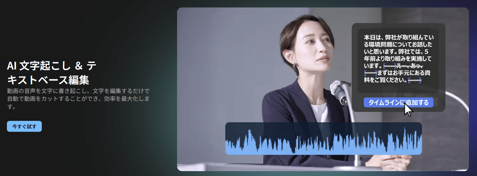 | AIを活用したテキストベースの編集 | 音声を文字起こしし、文字を編集するだけで動画カットまで進められる | 365系 | |