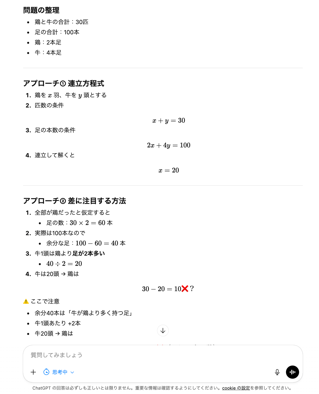 例えば、先ほどの動物の数の問題に対して、「ステップバイステップで考えてください」と指示すると、AIは以下のように段階ごとに生成してくれます。