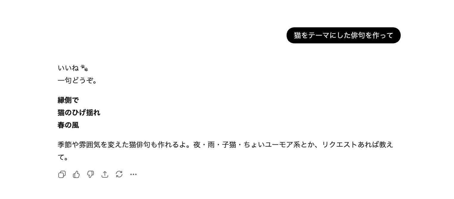 「相対性理論を子供でもわかるように説明して」や「猫をテーマにした俳句を作って」などの指示に対しても、事前に例文などを与えなくても、学習済みの知識から適切な答えを返すことができます。