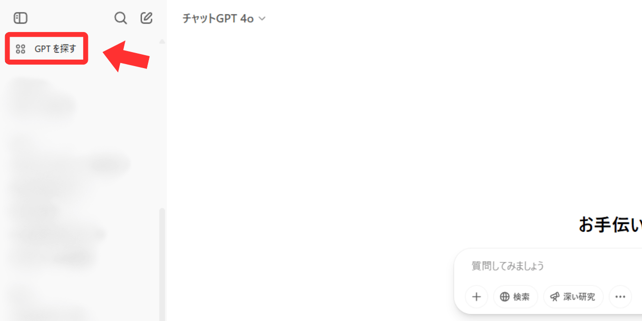 ChatGPTにログイン後、左側メニューにある「GPTを探す」をクリックします。