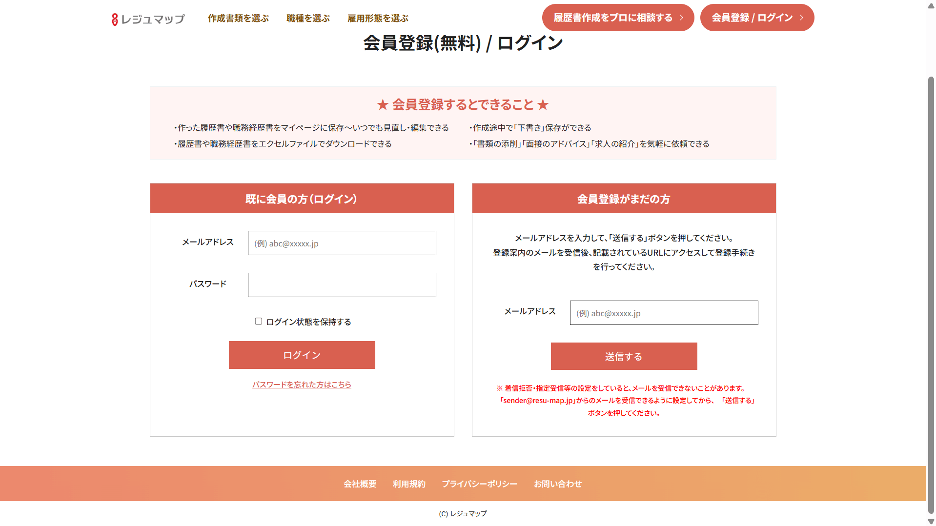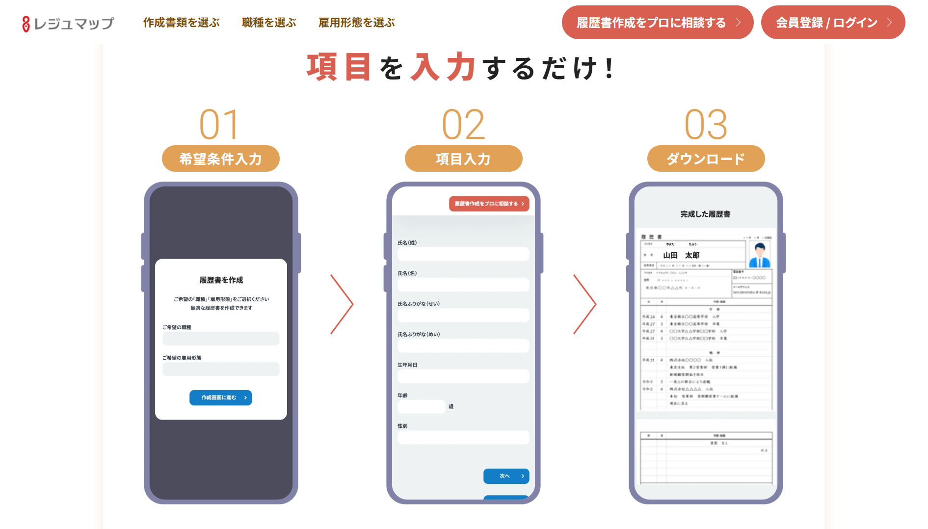 レジュマップは、ブラウザ上で履歴書と職務経歴書を作成できるサービスです。