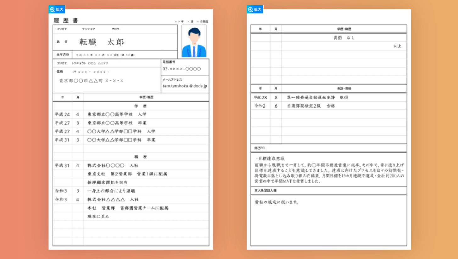 氏名・学歴・職歴・志望動機などの入力内容をもとに、AIが履歴書あるいは職務経歴書を生成します。