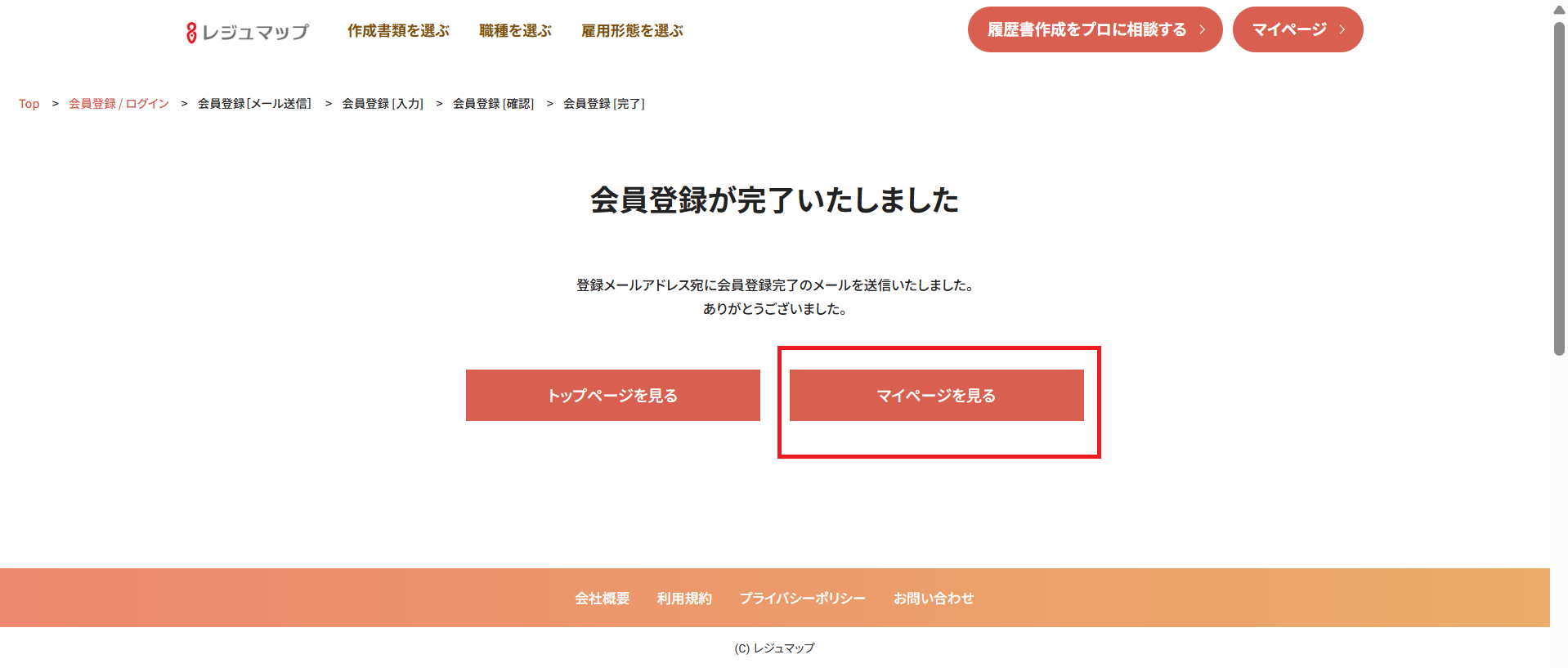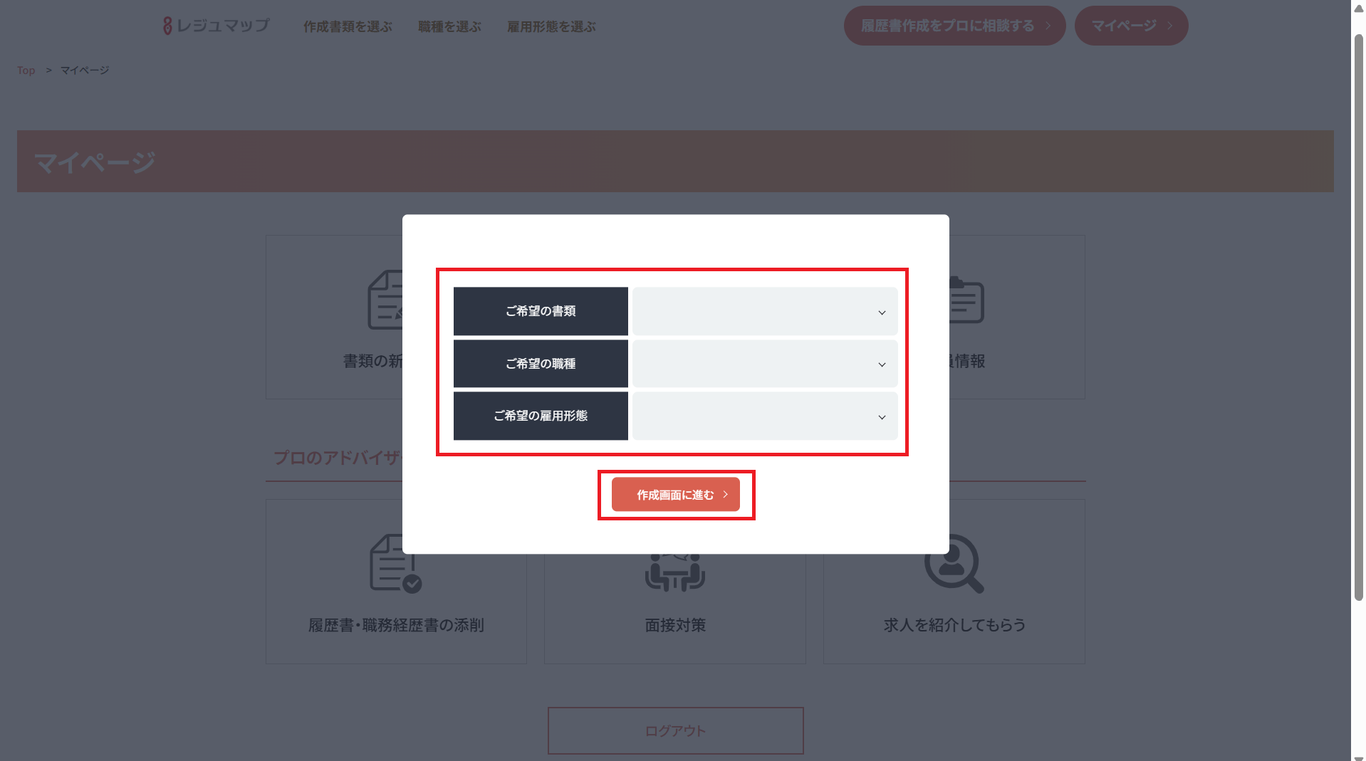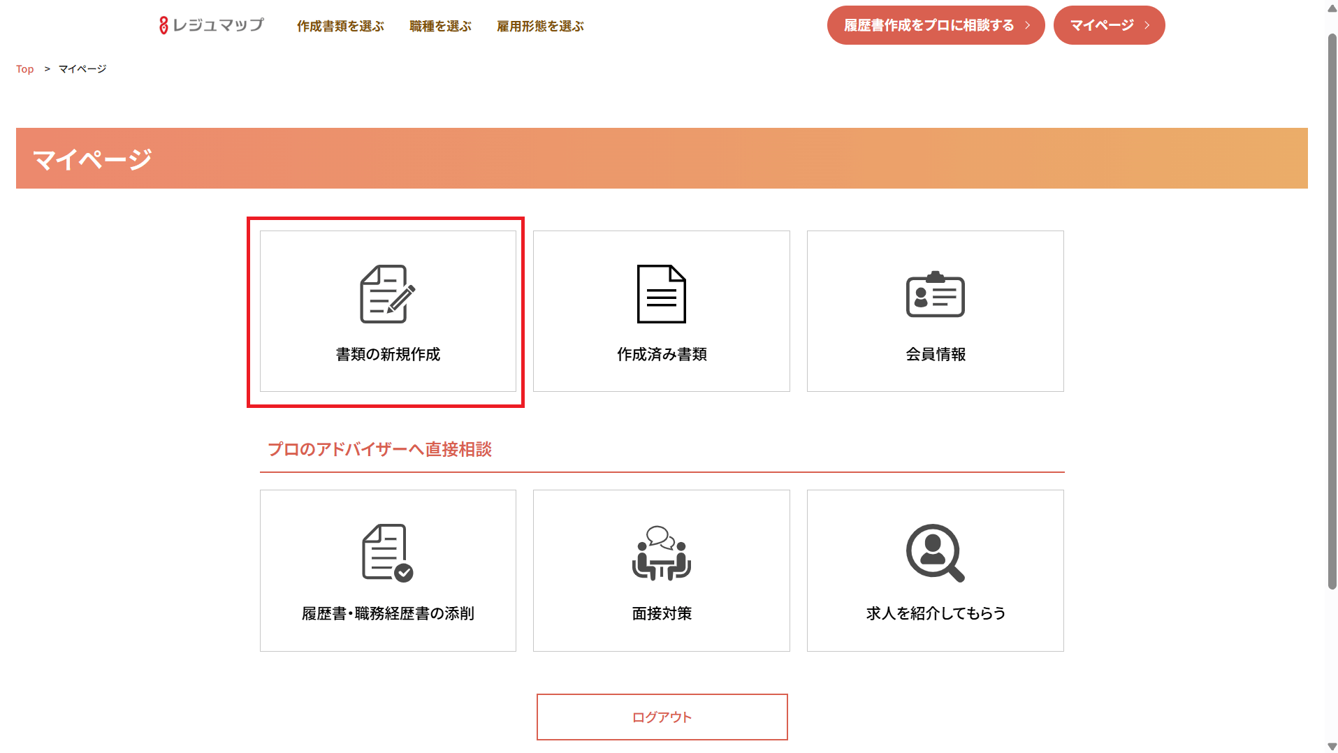 メールアドレスで無料登録し、マイページにログインします。ここから履歴書や職務経歴書の作成・保存・編集が可能です。