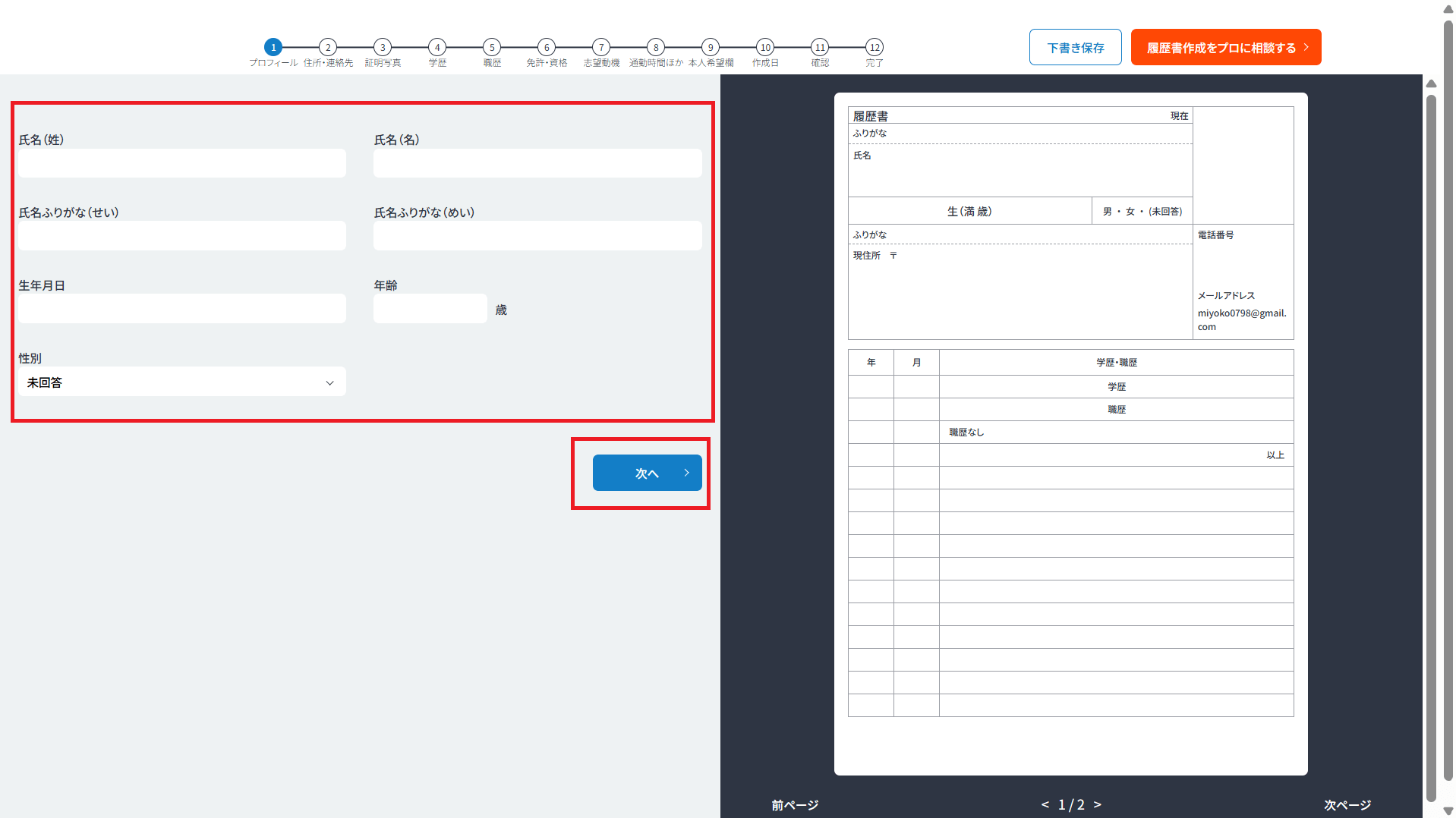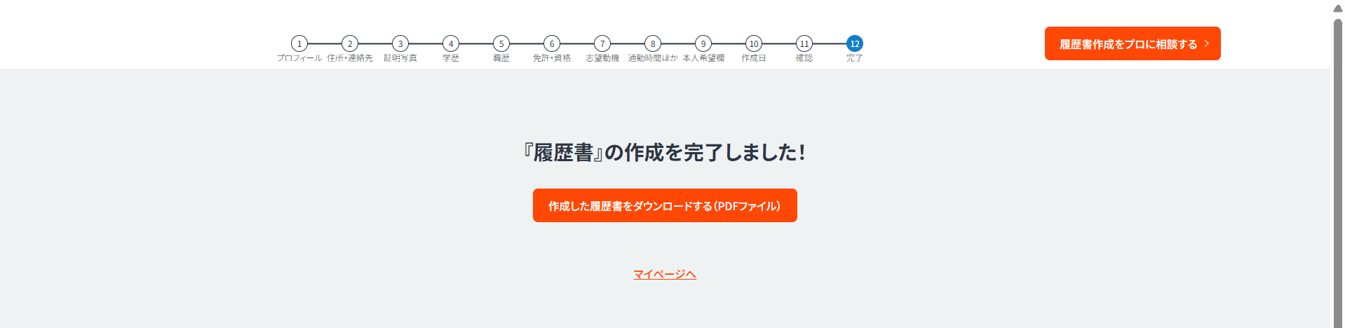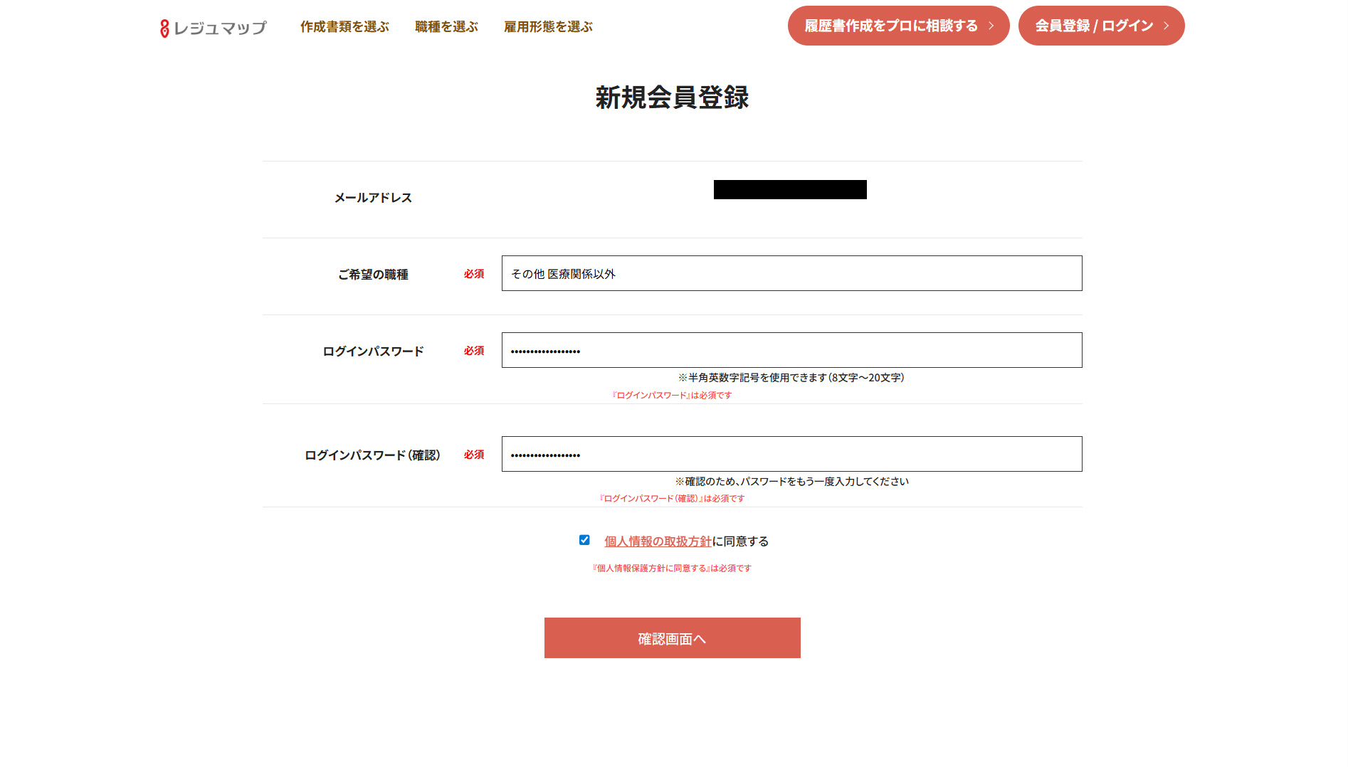 メールアドレスで無料登録し、マイページにログインします。ここから履歴書や職務経歴書の作成・保存・編集が可能です。
