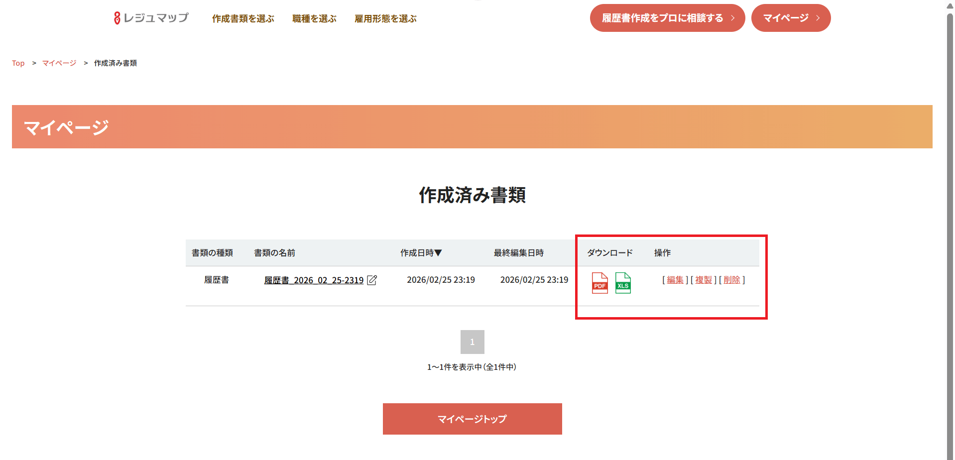 作成した書類は、「マイページ」から編集やダウンロードができます。
