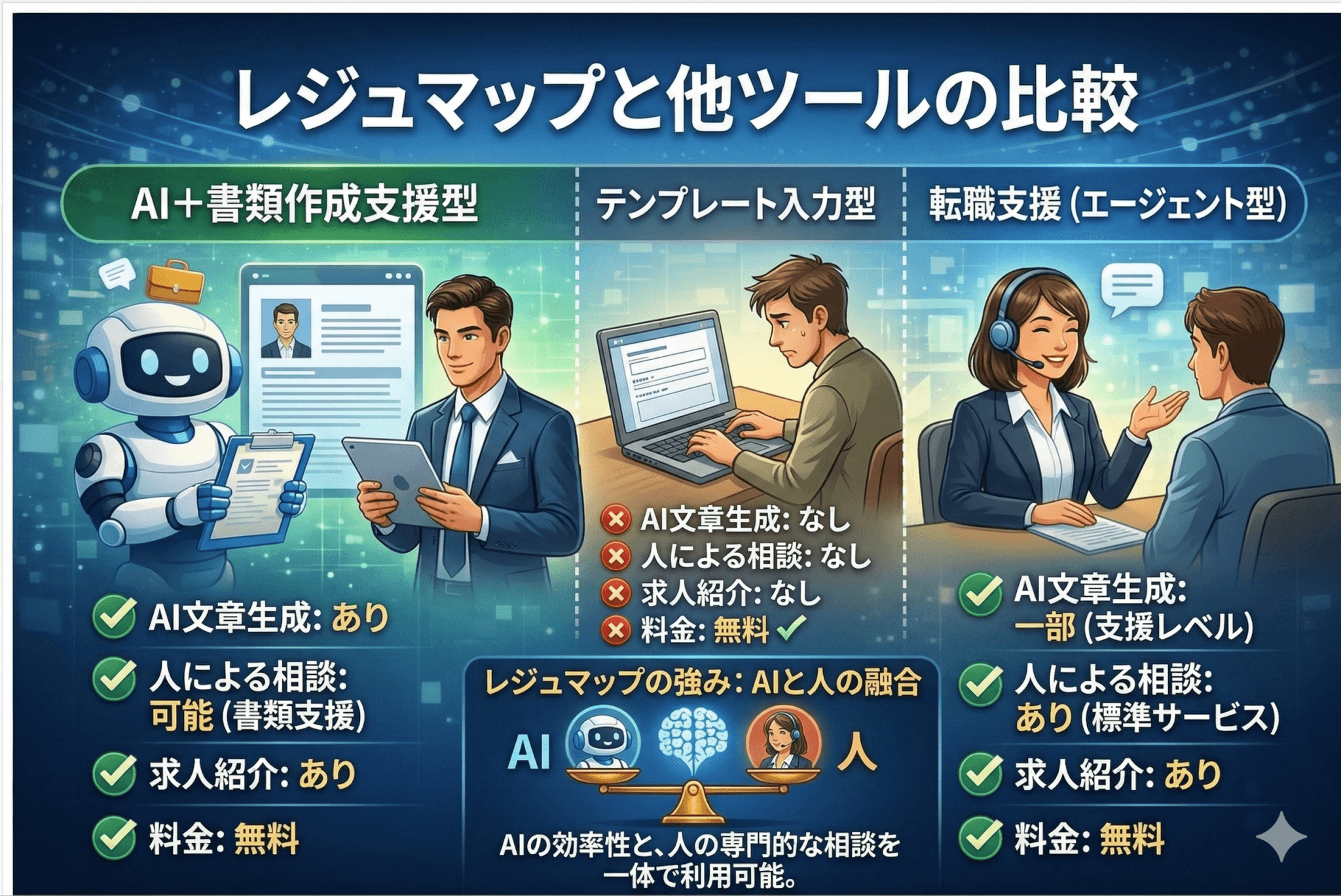 レジュマップは、AIによる文章生成と専門スタッフへの相談支援を一体で使える書類作成サービスです。テンプレート型や転職エージェント型との違いを比較しながら、どんな人に向いているかも合わせて確認してみましょう。