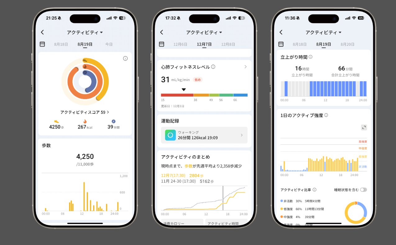 歩数や軽い運動は自動で記録されます。意識して操作する必要がないため、普段の生活をそのままデータ化できます。