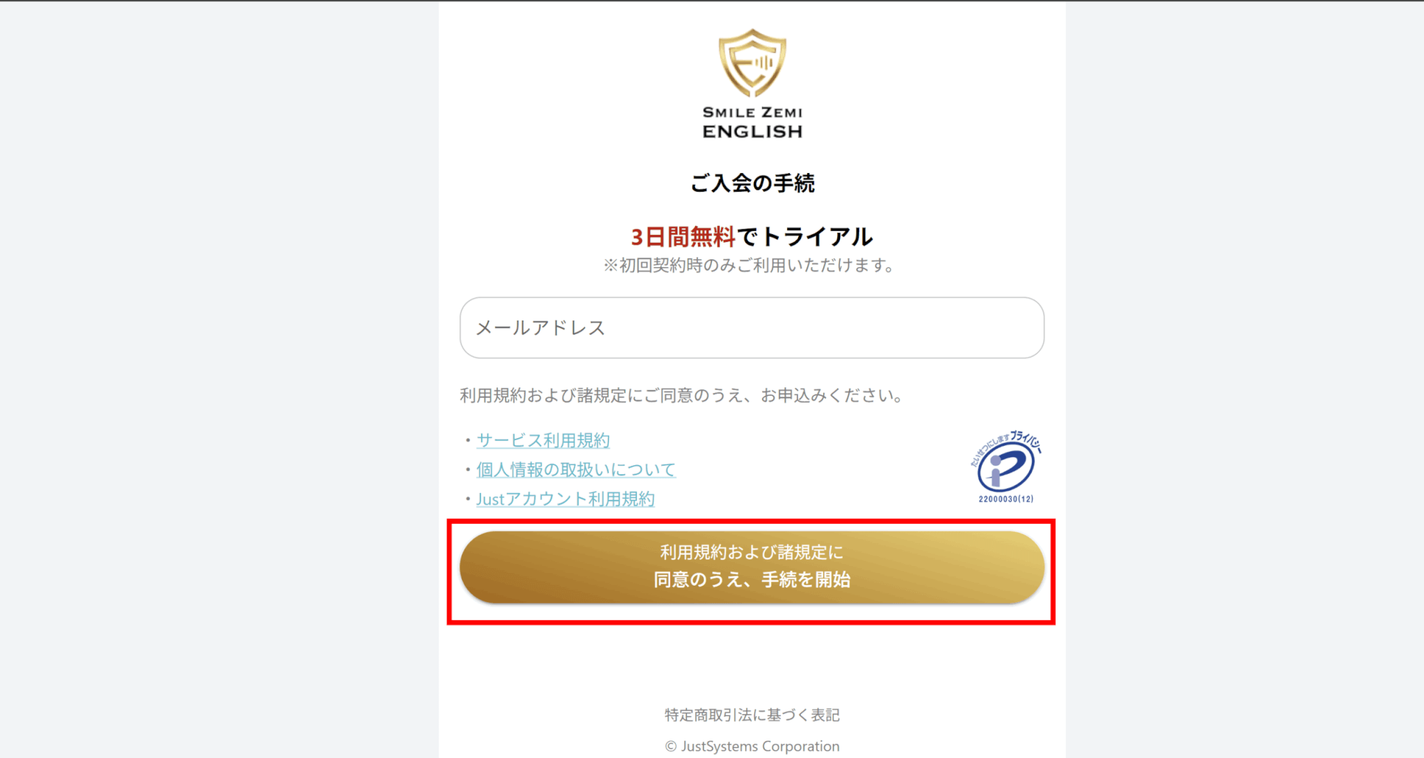 入会手続きの画面が表示されるので、メールアドレスを入力し、利用規約に同意して「手続きを開始」します。