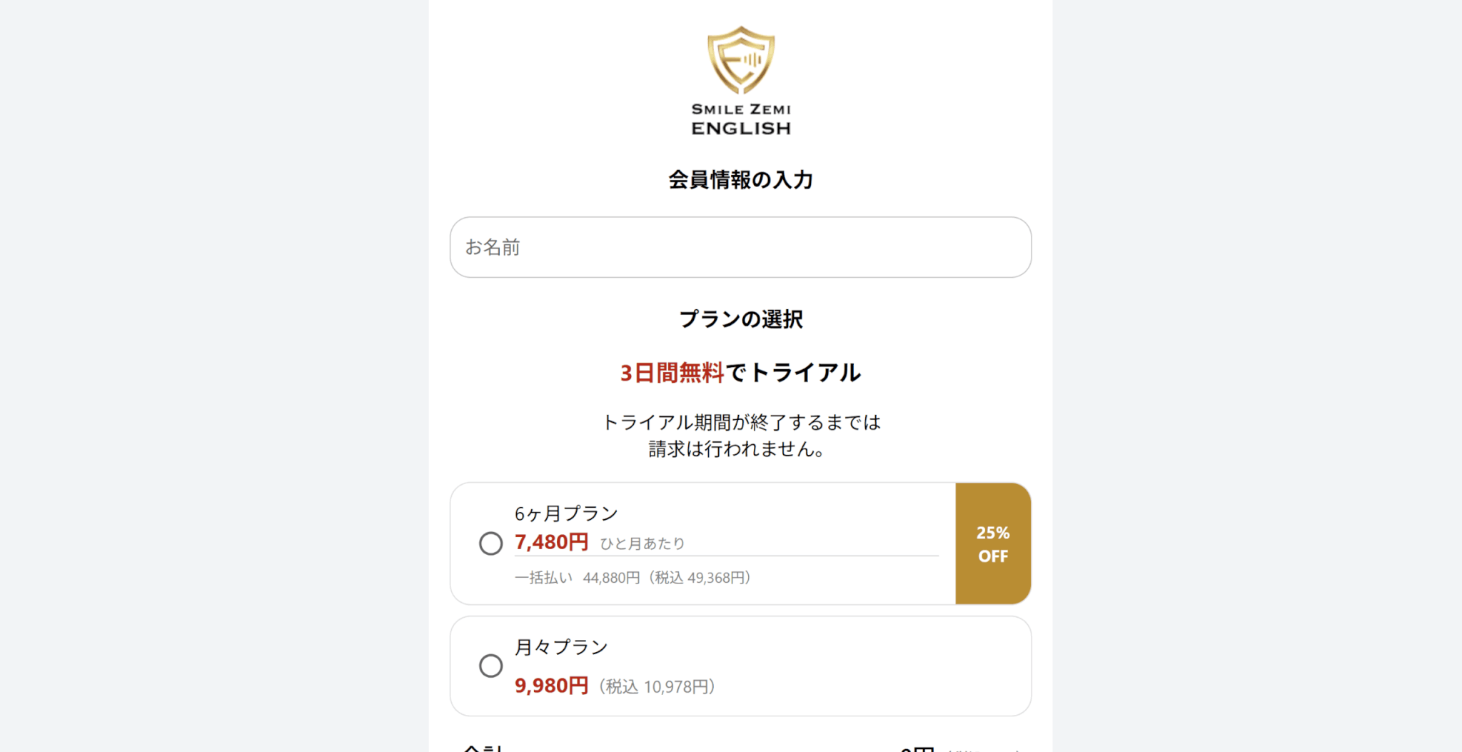 続いて会員情報として名前の入力とプランの選択が求められます。プランは2種類ありますが、機能に差はありません。長期的な利用を予定しているのであれば、6ヶ月プランを選ぶとひと月あたりの料金を安くすることが可能です。