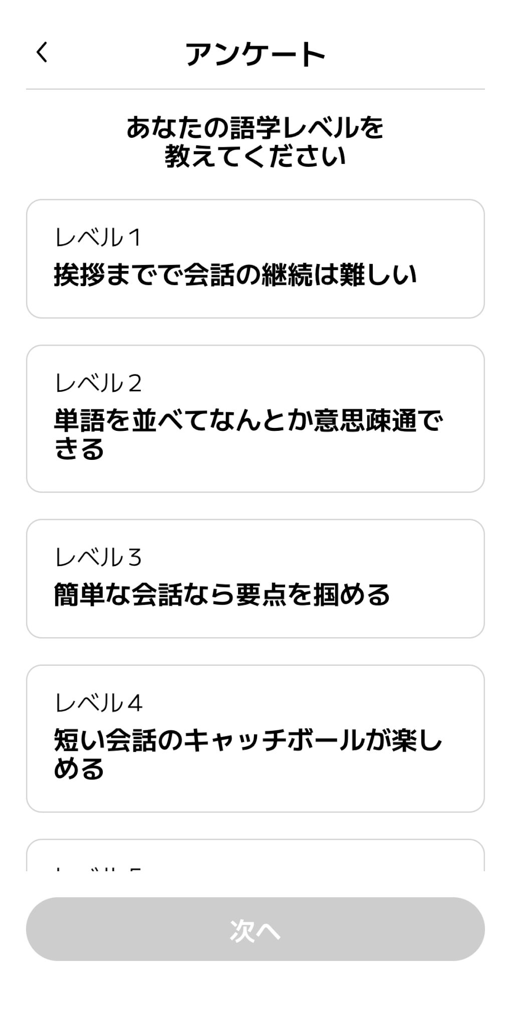 ログイン後は英会話学習についてのアンケートが表示されます。回答が終了すると、いよいよレッスンが受けられるようになります。