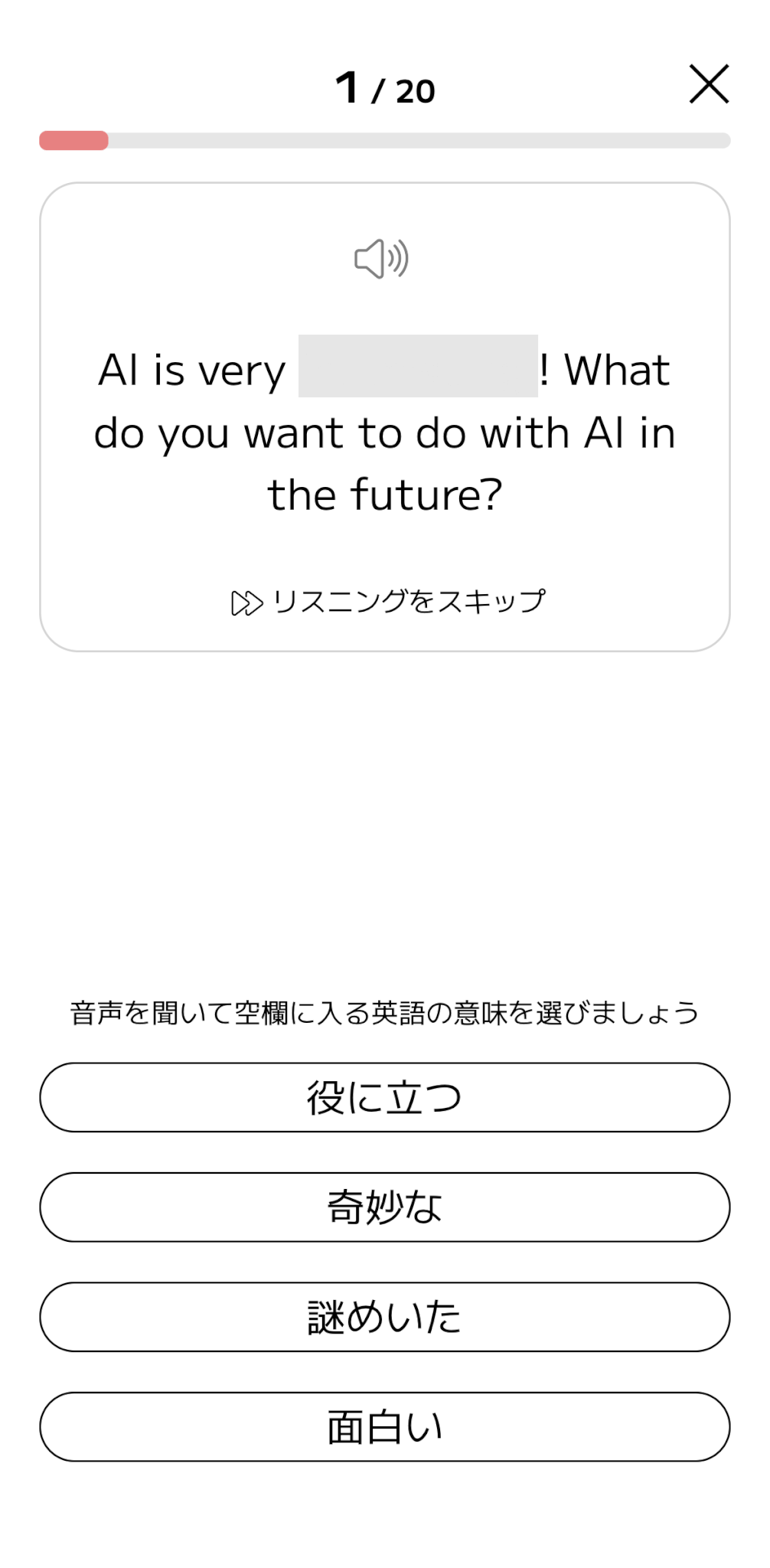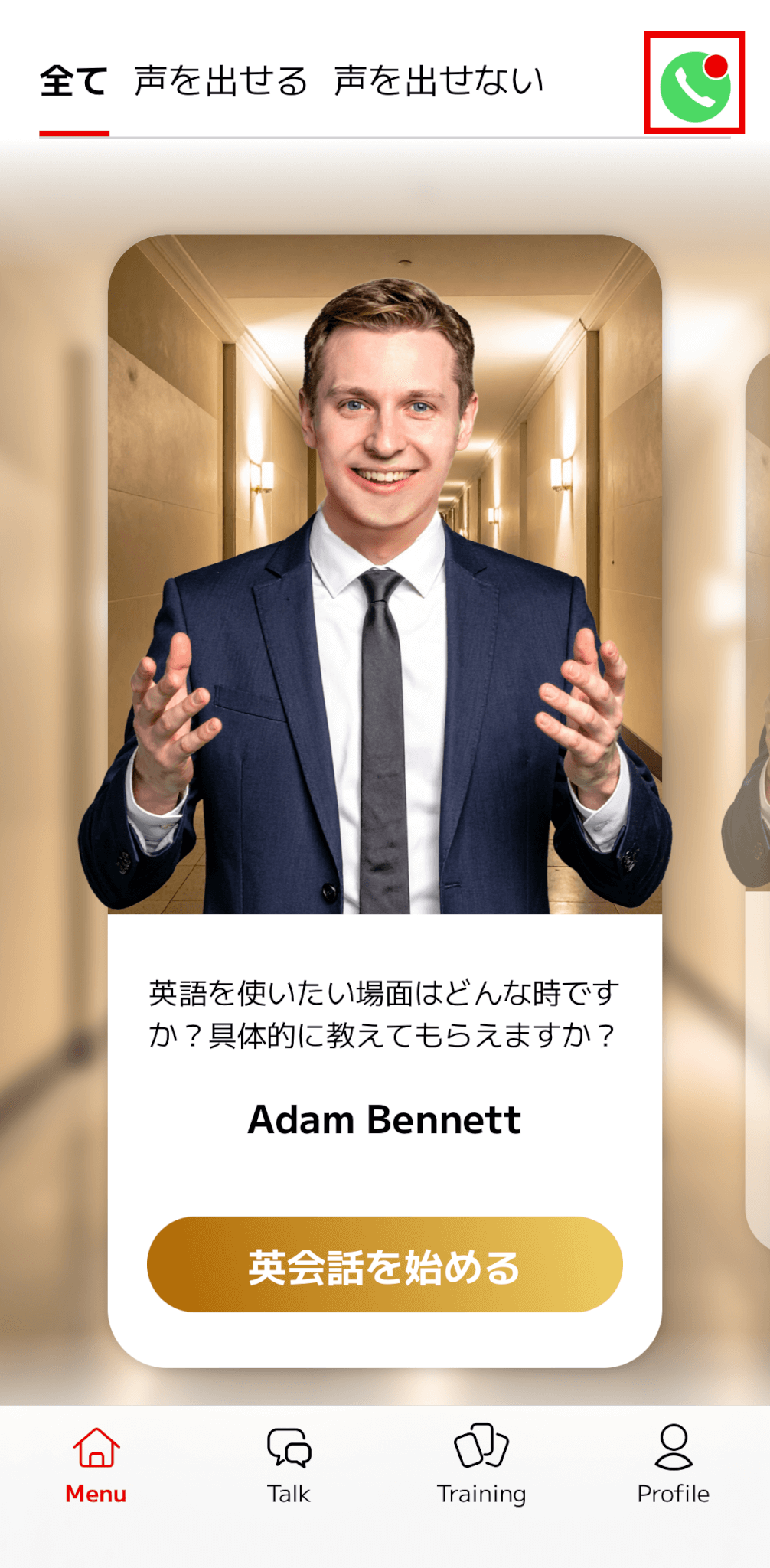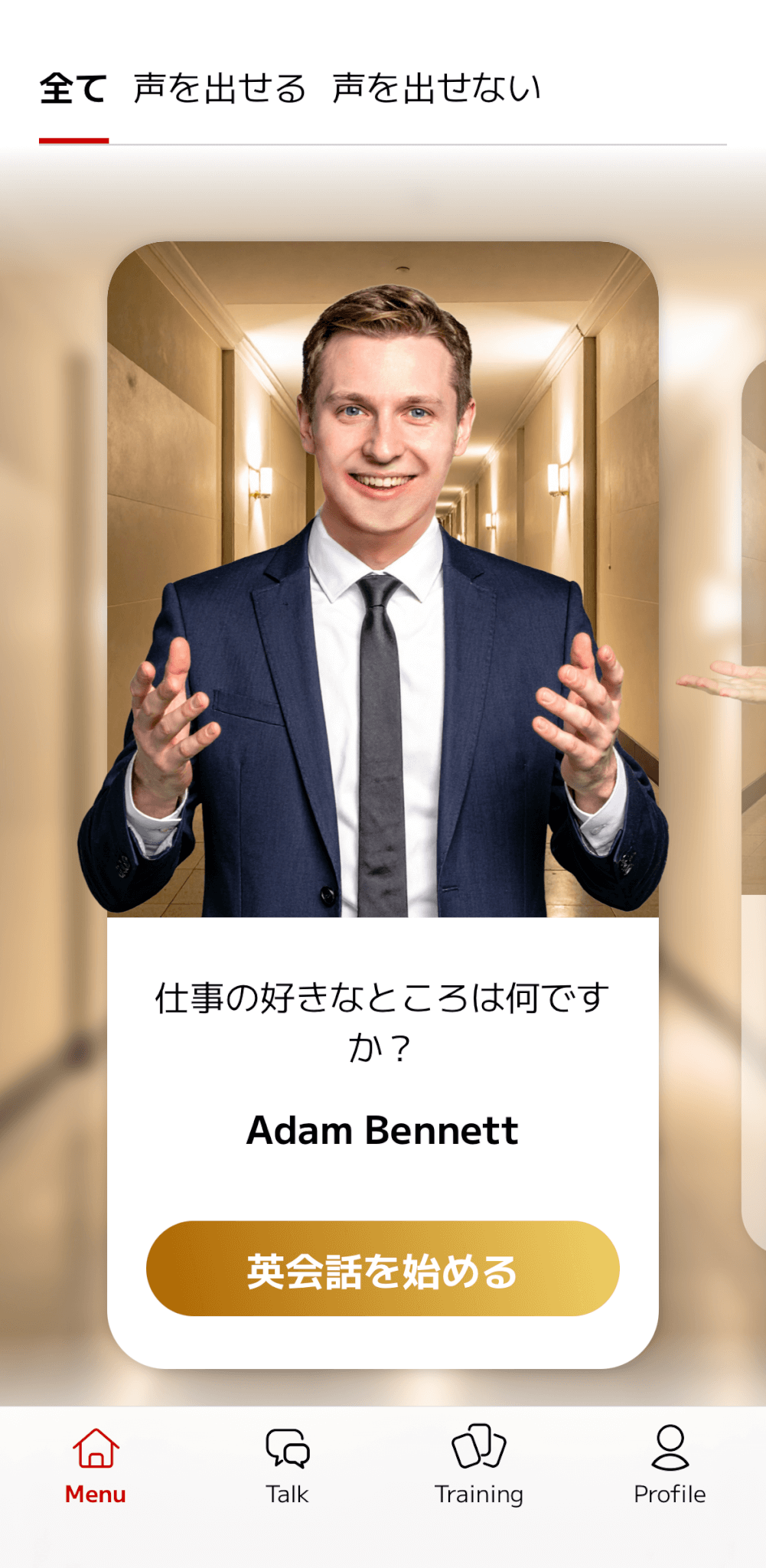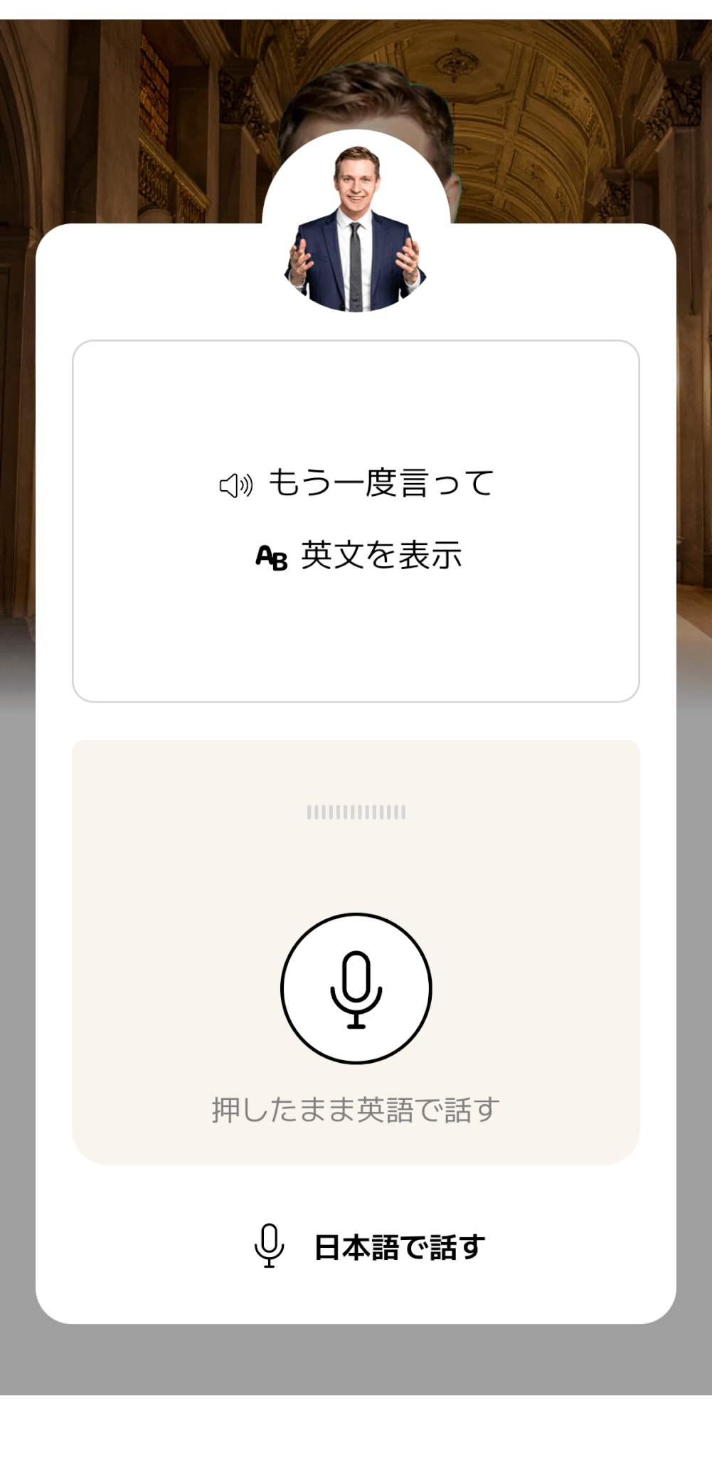 これまでのレッスンと異なり、日本語訳を見たり日本語で話したりすることはできず、より実践的な英会話の練習をすることが可能です。