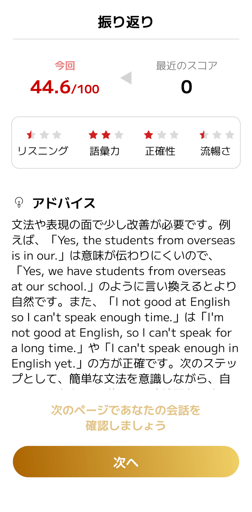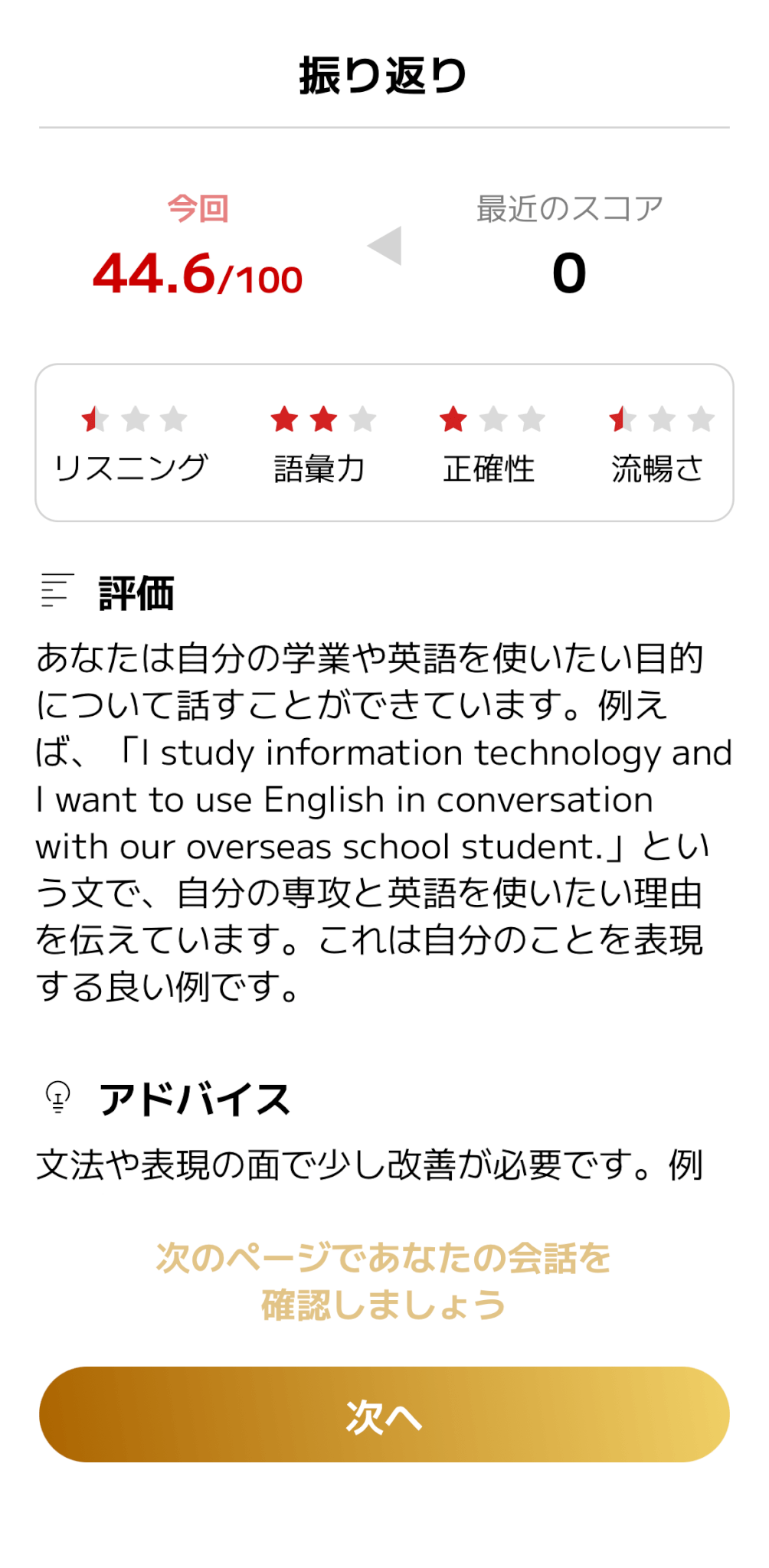 また、会話全体を通してのアドバイスをもらうこともでき、より自然な表現方法など改善点を知ることができます。