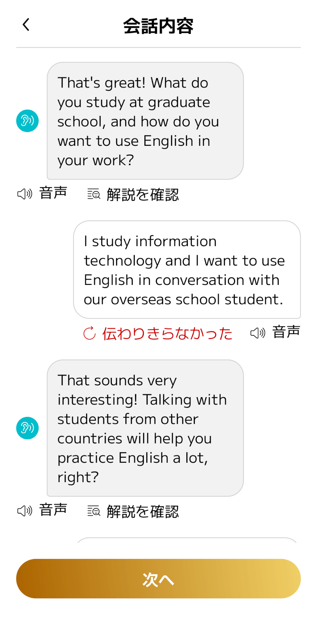 会話終了後のフィードバックでは、会話についてのスコアや改善点、そして会話の全やり取りの確認が可能です。