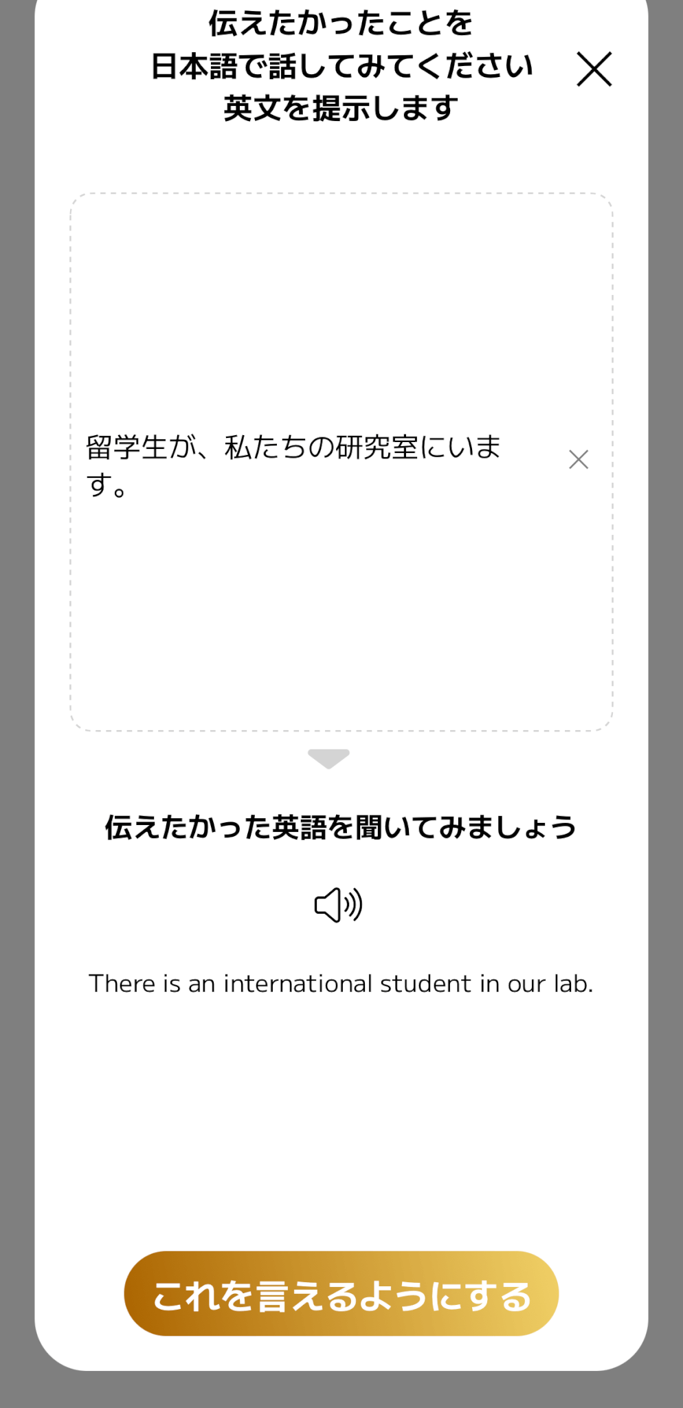 自分の発言について、英語で話したがうまく伝わらなかった部分については、改めて日本語で話すことで最適な英文が提示されます。