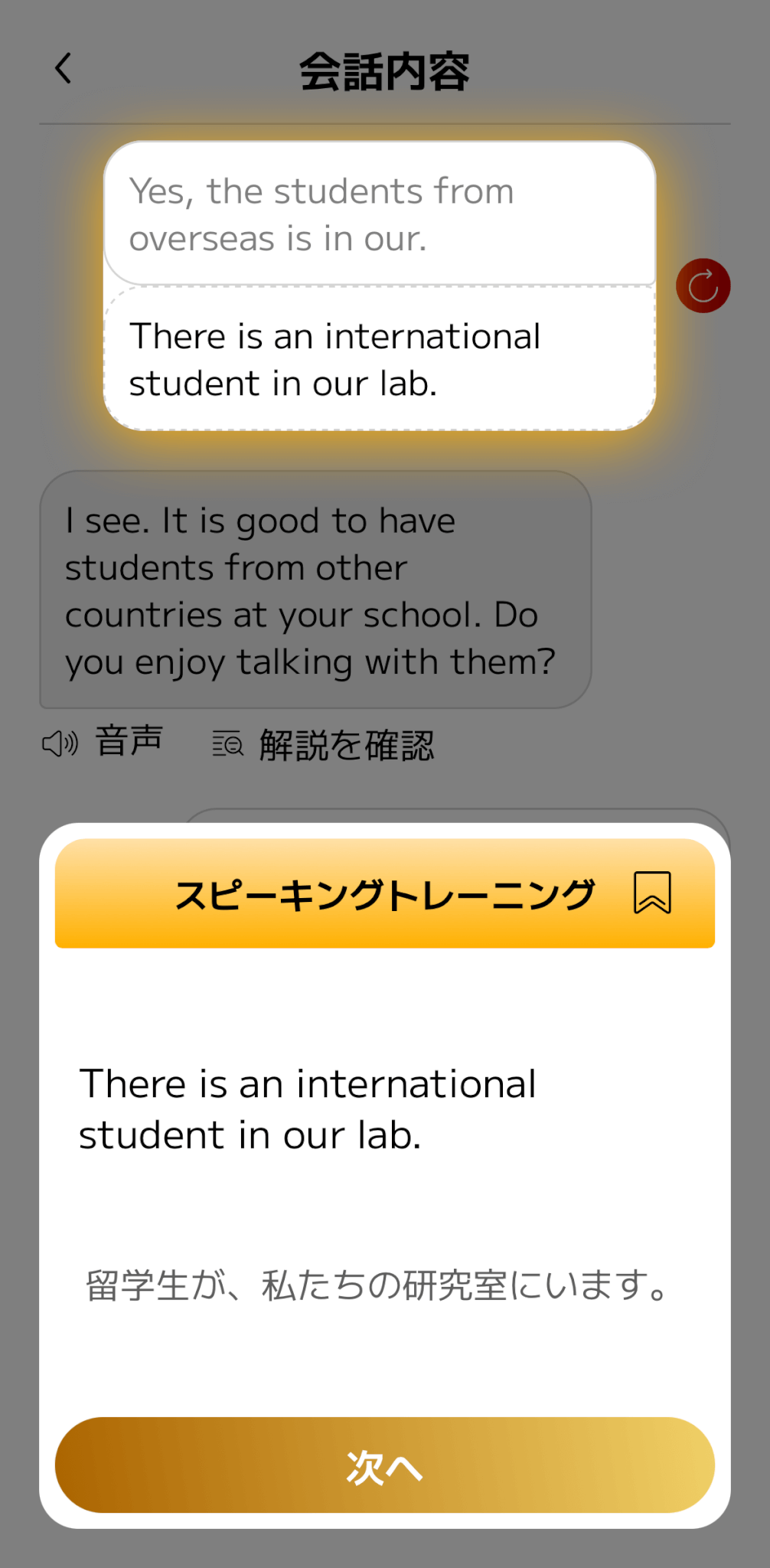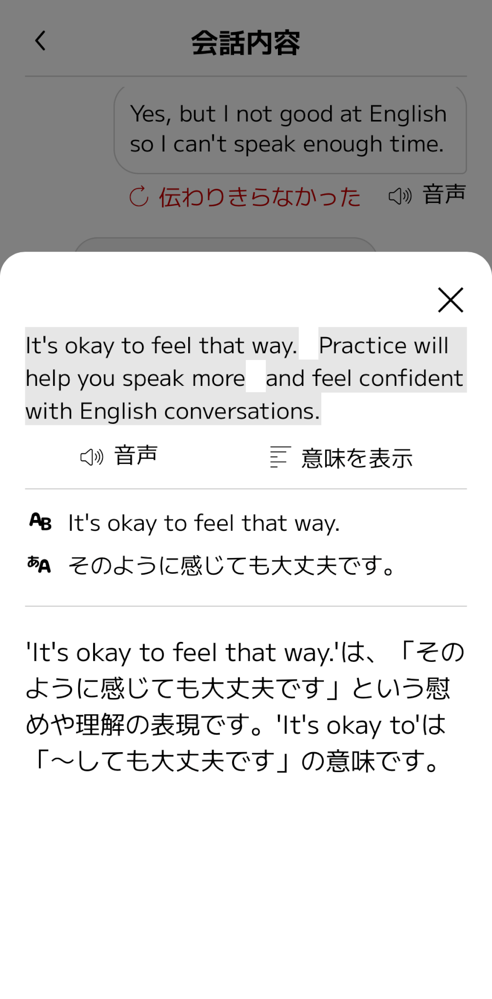 さらに、会話内容の振り返りも可能です。この振り返りでは、コーチの発言についての解説や日本語訳を見ることが可能です。