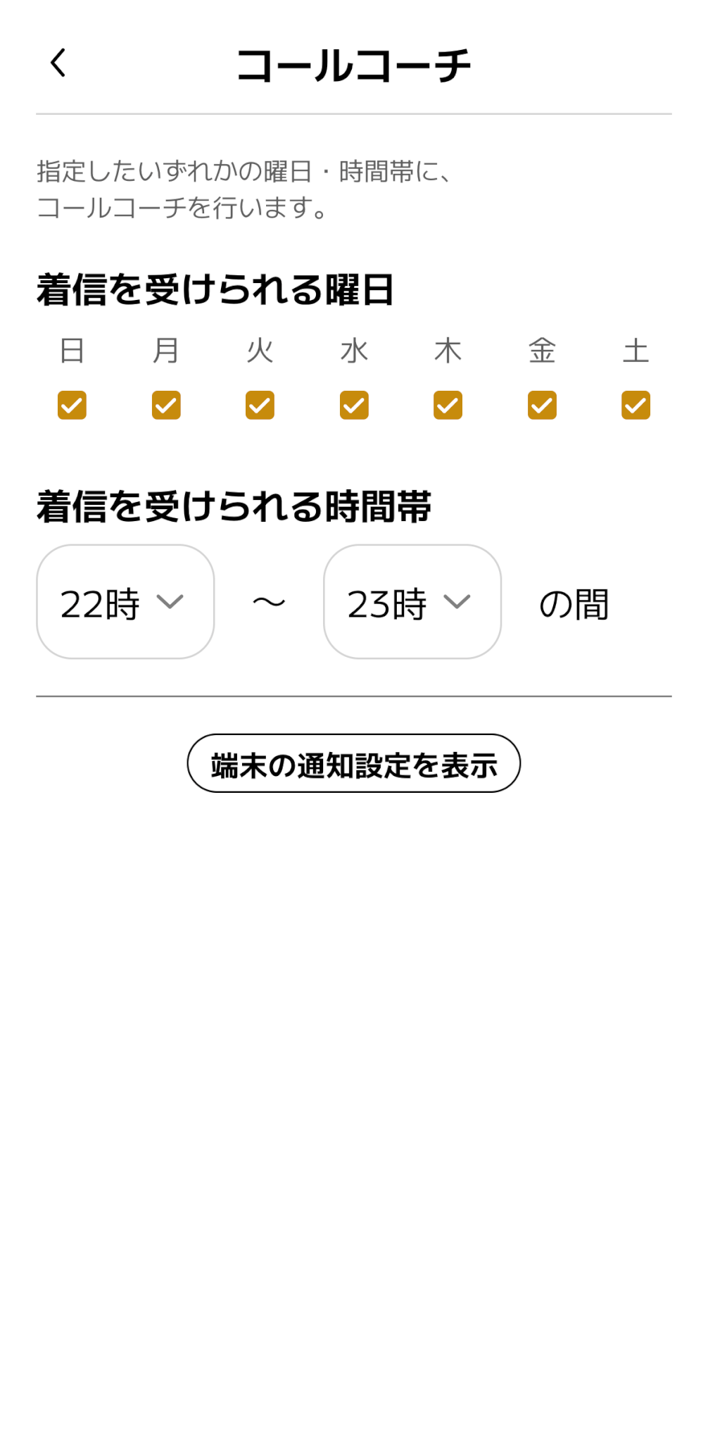 まずは設定から、コールコーチの着信を受け取る曜日と時間帯を指定しましょう。指定した日程のいずれかでコールコーチが実施されます。