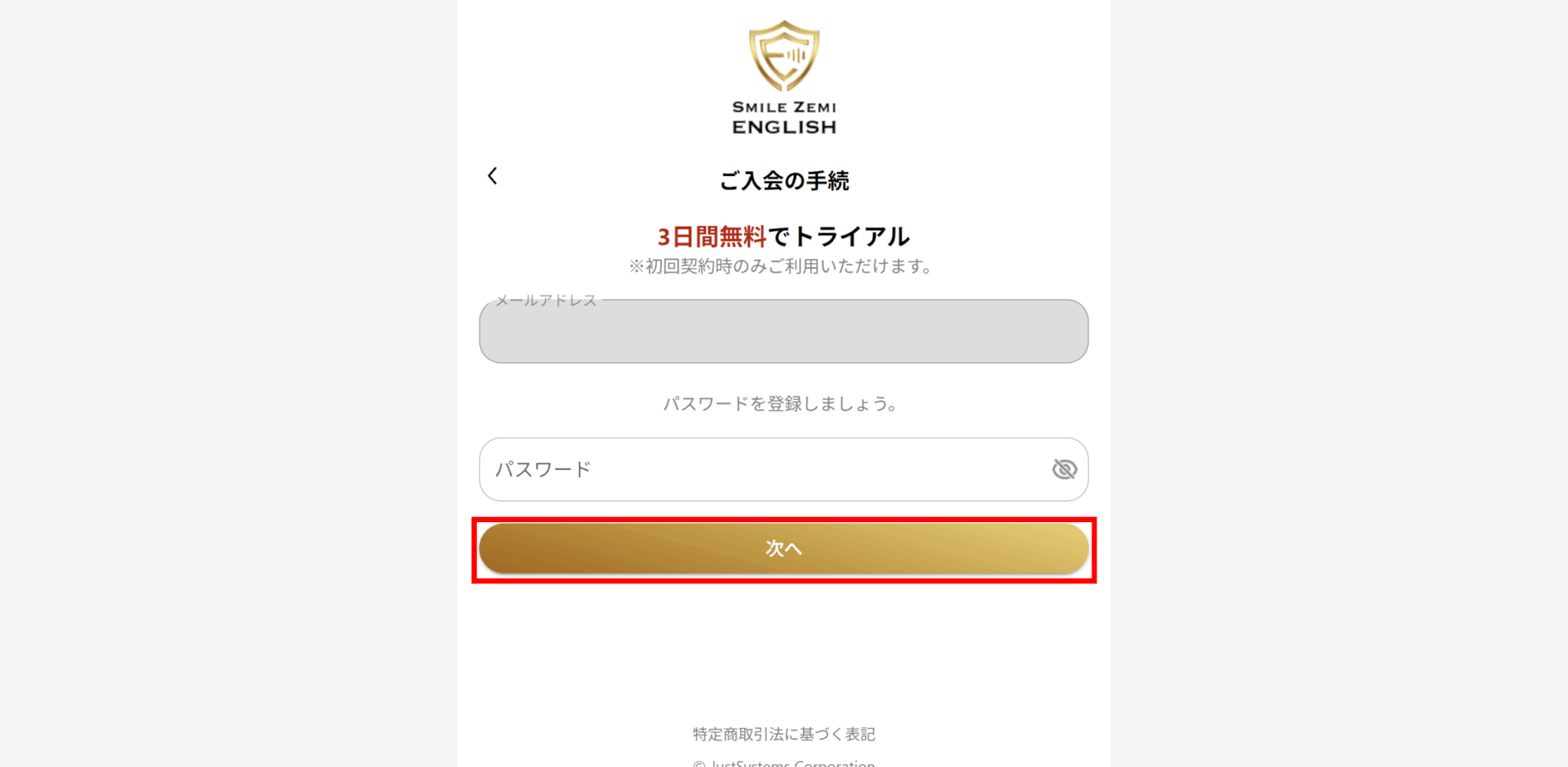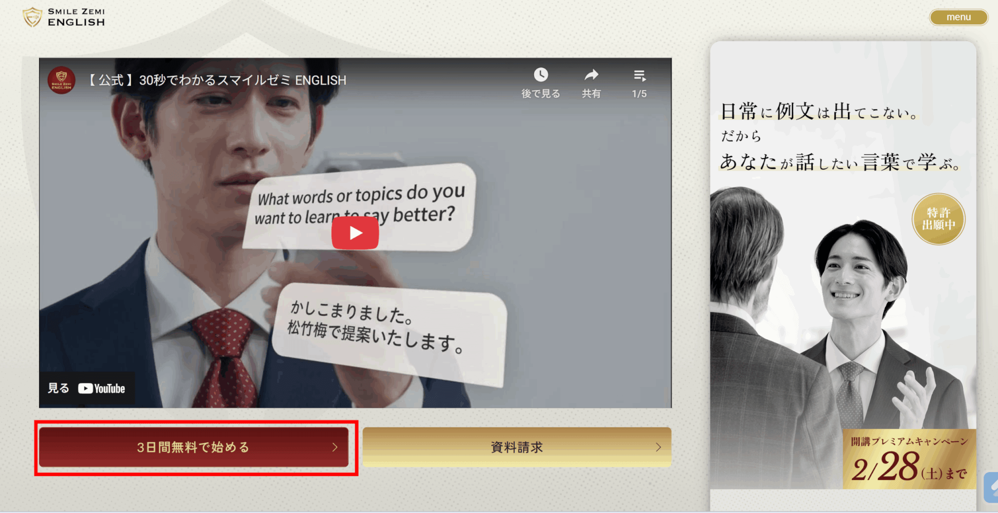 スマイルゼミ ENGLISHは現在3日間の無料トライアルを実施しているため、「3日間無料で始める」をクリックします。