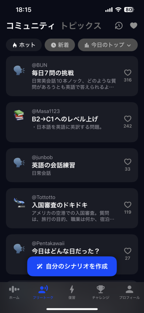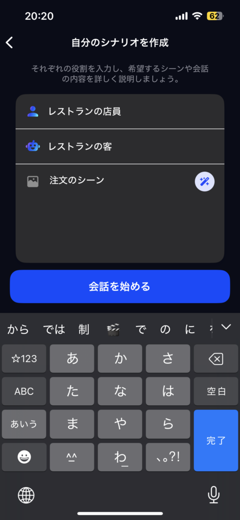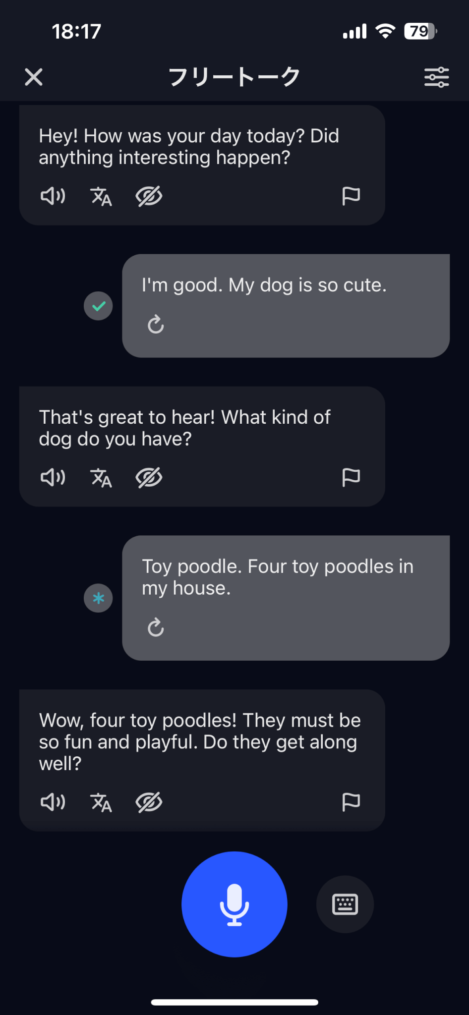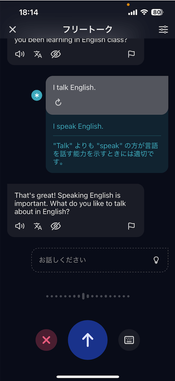 まるで人間と対話しているような感覚で、トピックも多岐にわたるため、飽きずに英語に触れ続けられます。自分でシーンを設定して英会話に没入できます。