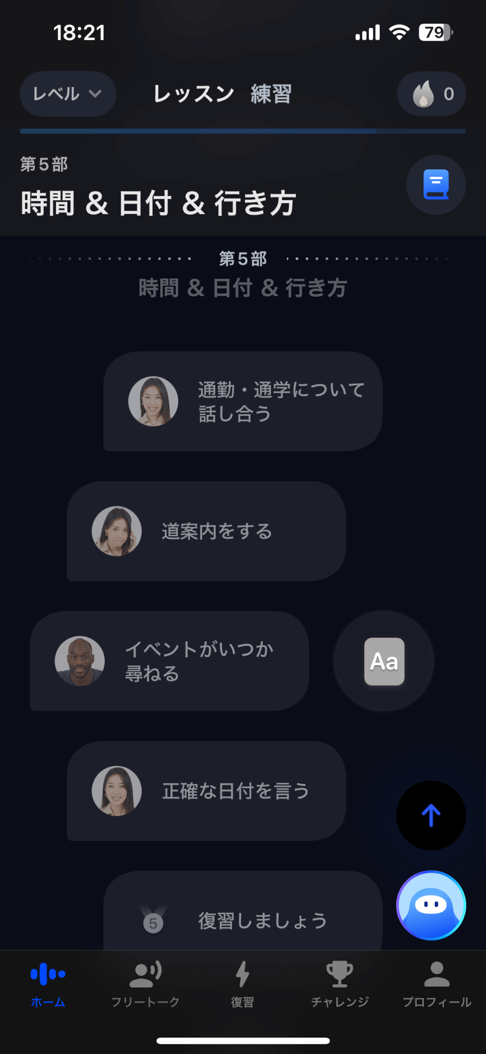 まず、ELSA Speakはあくまで発音の正確性を追求することに特化しているため、AIとの会話機能は用意されているものの、特定の場面でのロールプレイが中心となります。雑談や自由なトピックで会話を広げるようなフリートークの練習がしたい場合には不向きです。