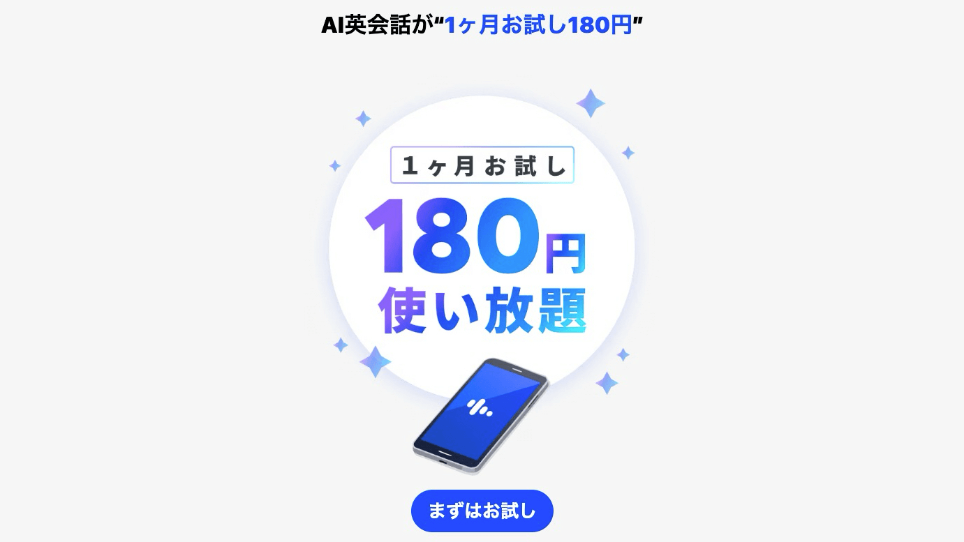 AI英会話アプリ「Speak(スピーク)」は、Web申し込み限定で「1ヶ月お試し180円使い放題」の割引キャンペーンを実施中※1。割引を利用すれば、飲み物1本分の価格でスタートすることができます。