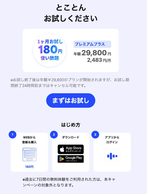 ただし、注意点として、この「7日間の無料体験」と「1ヶ月180円キャンペーン」は併用できず、どちらか一方を選択する形になります。無料体験よりも180円使い放題の方が、非常にリーズナブルな価格でじっくり1ヶ月試せるため、無料体験よりも圧倒的にお得にSpeakを始めることができます。