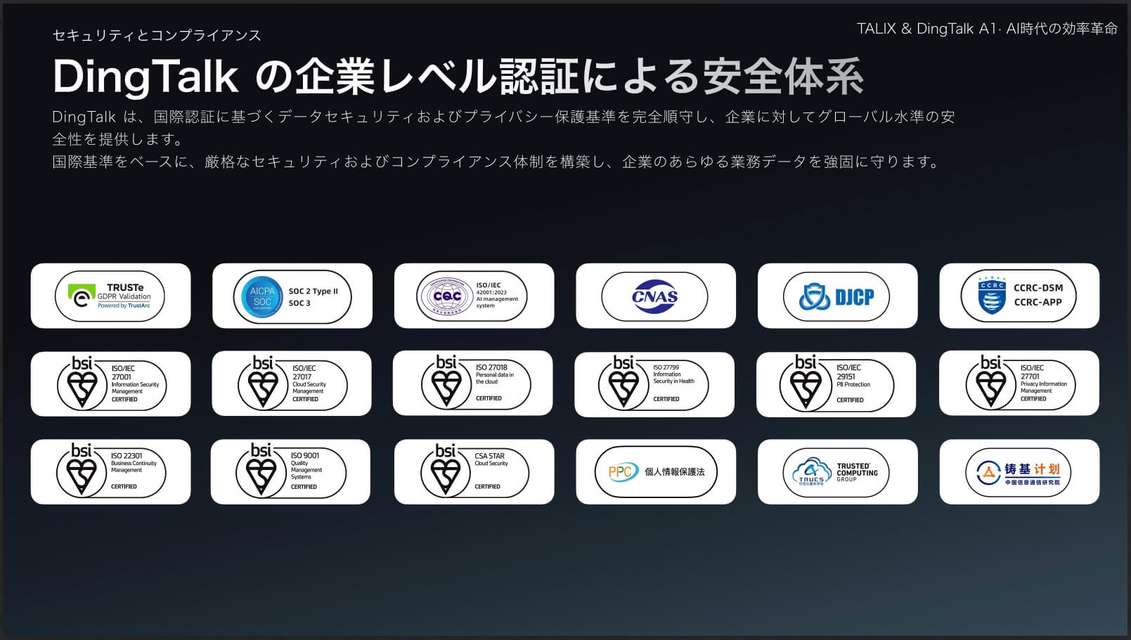 DingTalkは、SOC 2レポート・ISO規格など、情報セキュリティに関する国際的な基準に対応しています。